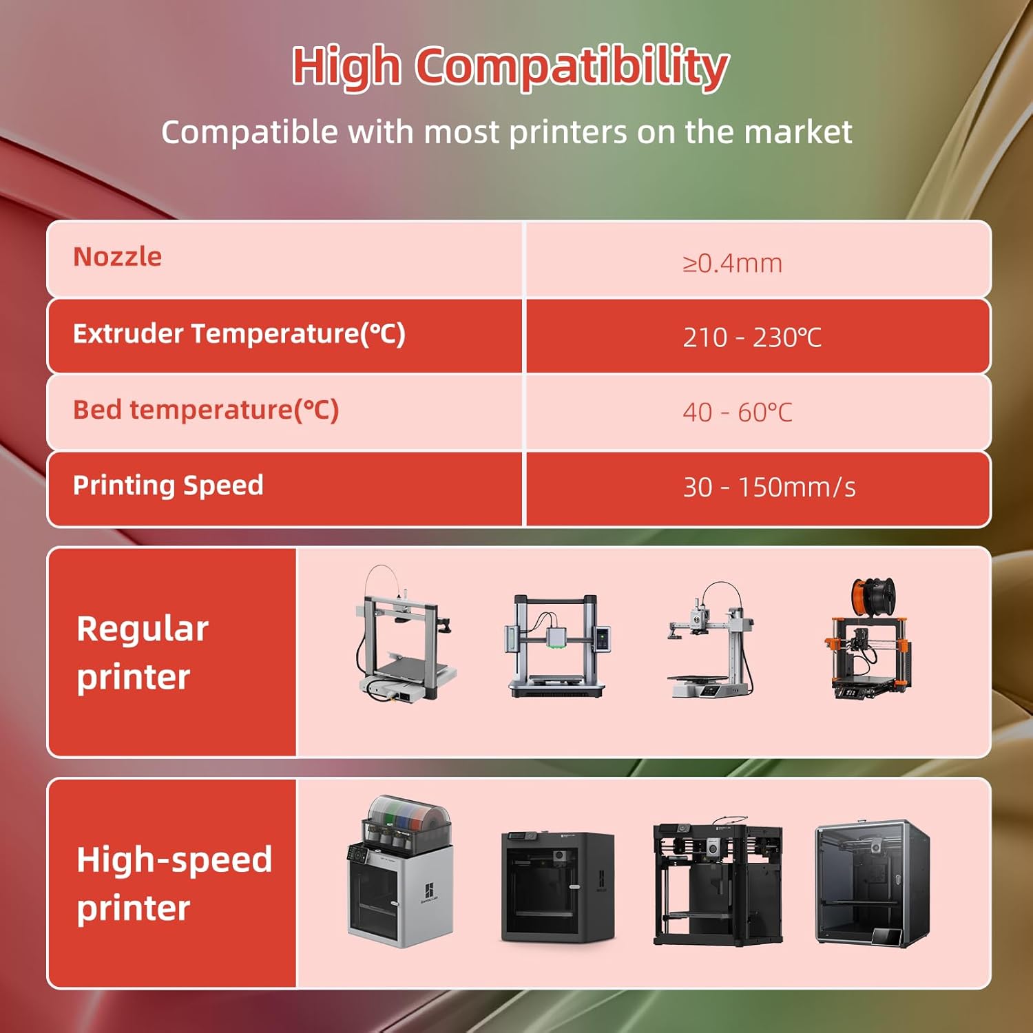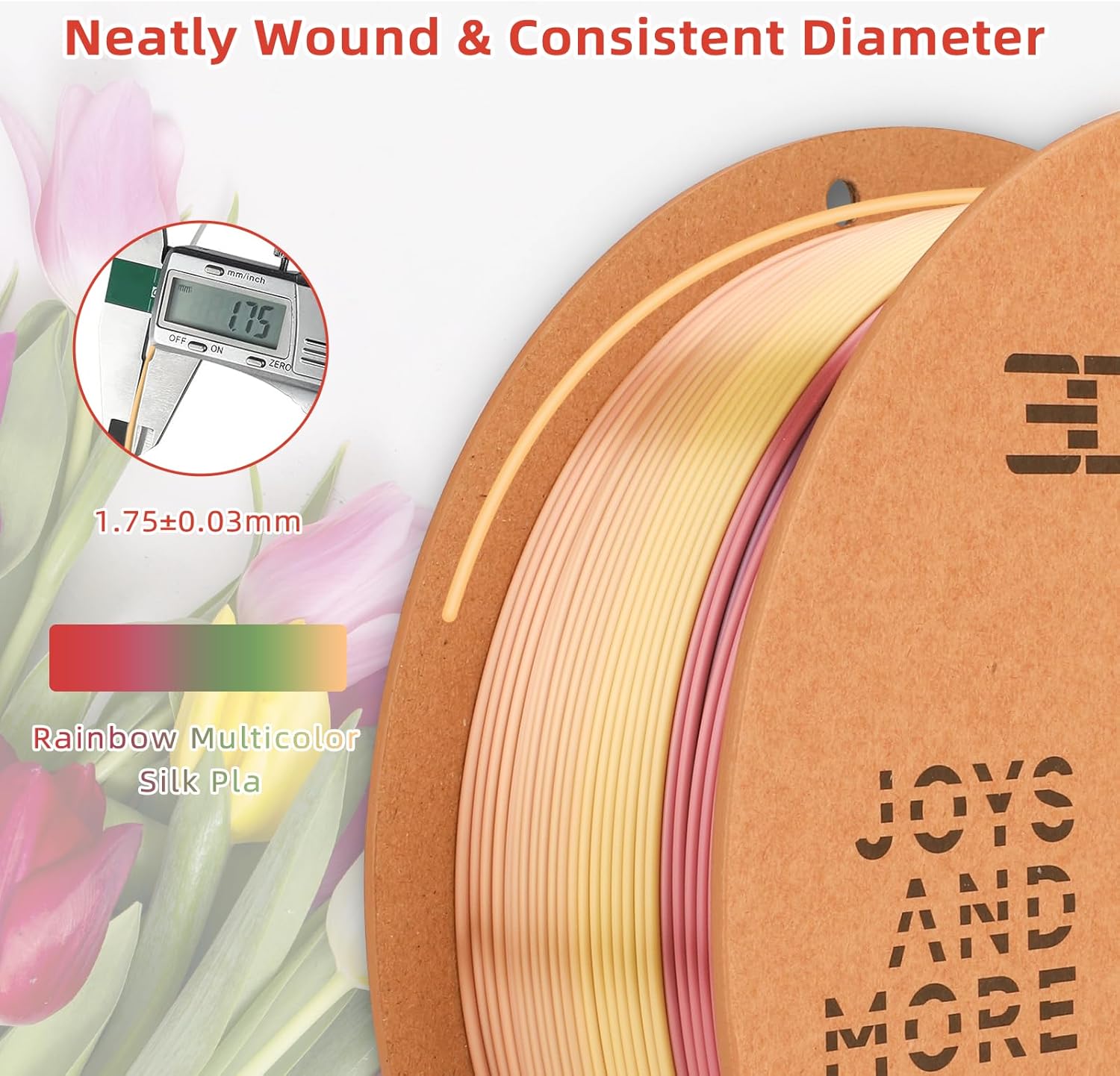 - 【Rainbow PLA filament 】Color changing every 15 meter with rich and natural gradient color change. You can printout 3D items smooth,multi-colored, even intricate. Only need to print small models to show all the colors. Tulipa color consists of silk red, orange, green, violet.