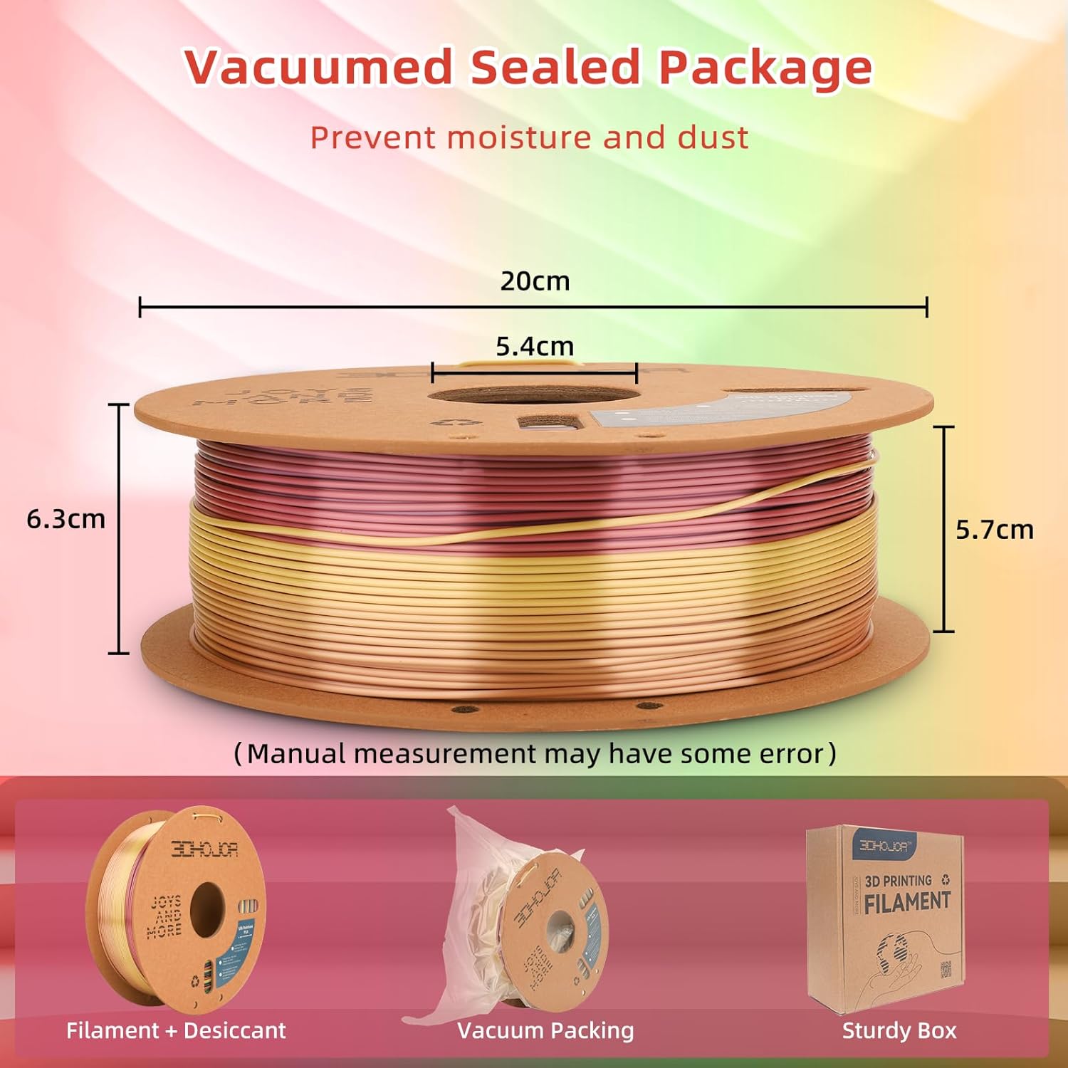 - 【After-sale service】All spools are vacuum-packed, which protects filament from moisture and dust. If you are in a humid environment, drying before use will ensure optimal printing results. In case of any quality problem, please feel free to contact us for after-sales service.