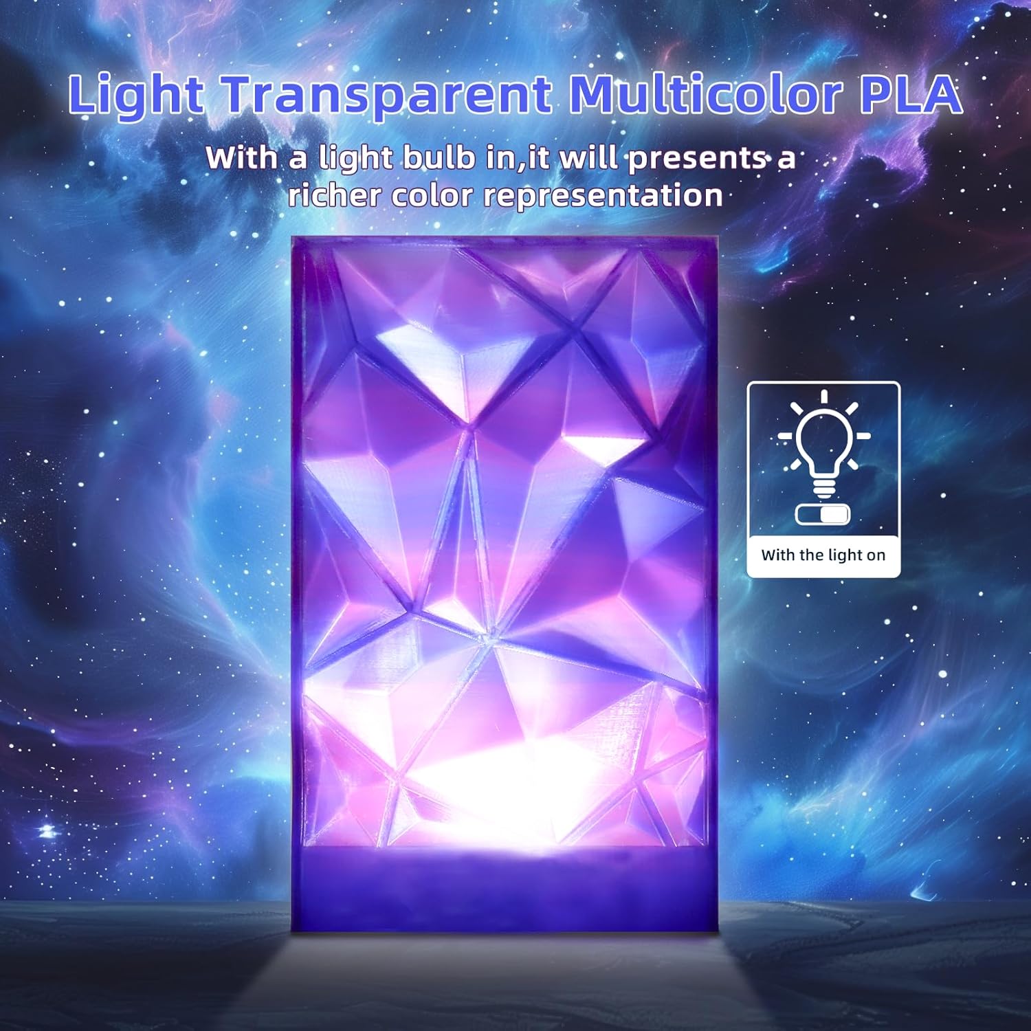 - Multicolor transparent PLA Filament: Multicolor color changing mixed in one spool filament and presents a rich visual aesthetic. You just need print about 100g and it shows all colors.