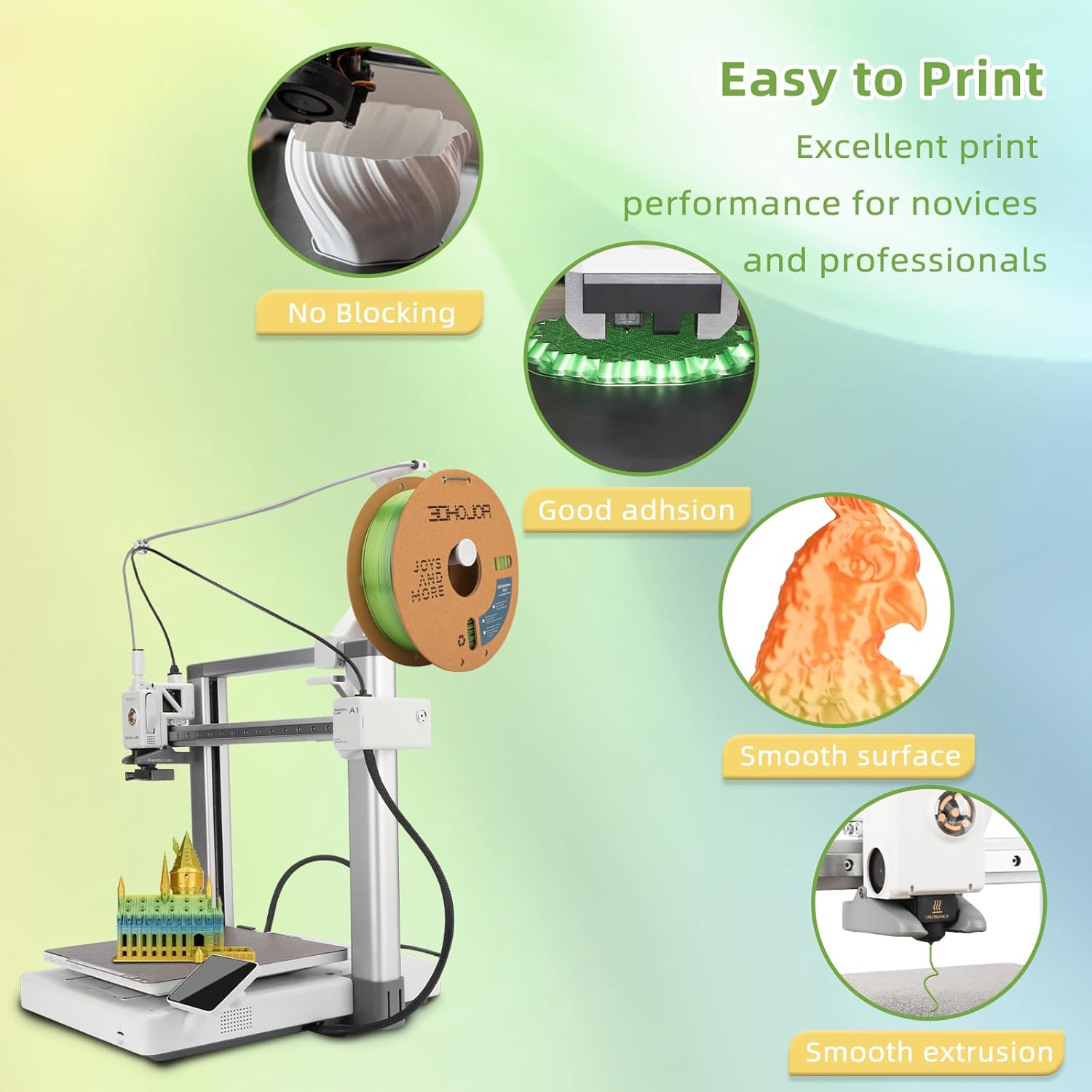 - 【Rainbow PLA filament 】Color changing every 15 meter with rich and natural gradient color change. You can printout 3D items smooth,multi-colored, even intricate. Only need to print small models to show all the colors. Ivy color consists of silk green, blue, yellow