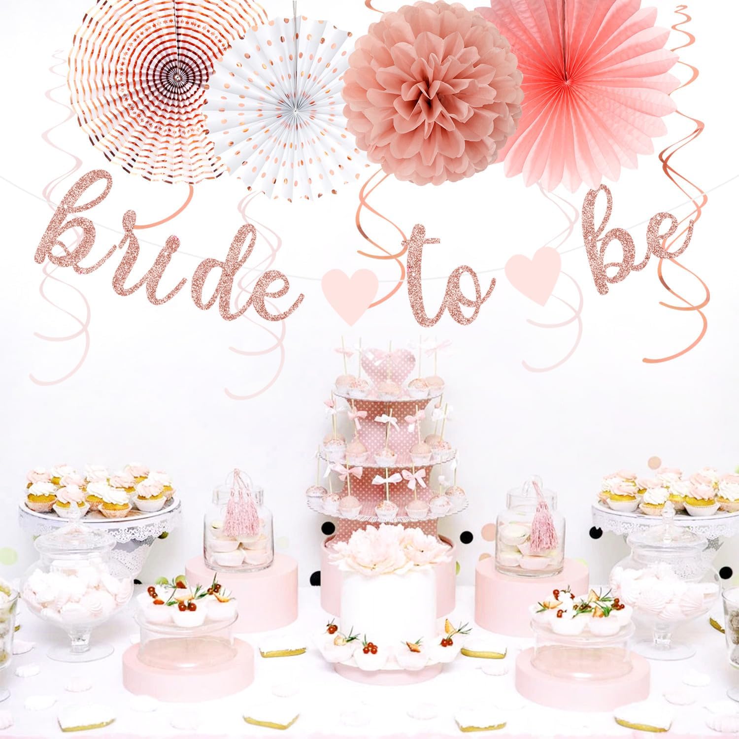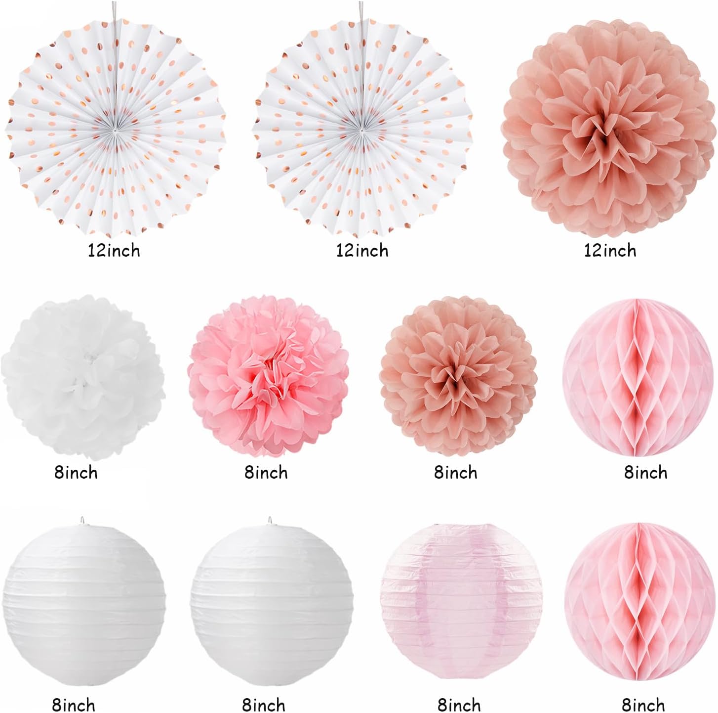 - 【Rose gold Light Pink White Party Decorations kits】This kits include 1pcs bride to be banner, 1pcs circle dots paper banner, 4pcs tissue flower pom poms: 3pcs 10" and 1pcs 12" , 3pcs 8inch paper honeycom ball, 2pcs 8inch paper lantern, 4pcs 12inch paper fan, 6pcs Paper swirls hanging streamers