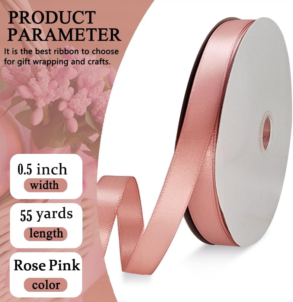 Rose Pink Satin Ribbon Double Faced Satin 1/2 inch x 55 Yards Polyester Ribbon for Gift Wrapping Crafts Wedding Decoration Bows Ornaments Party Bouquet Floral Arrangement