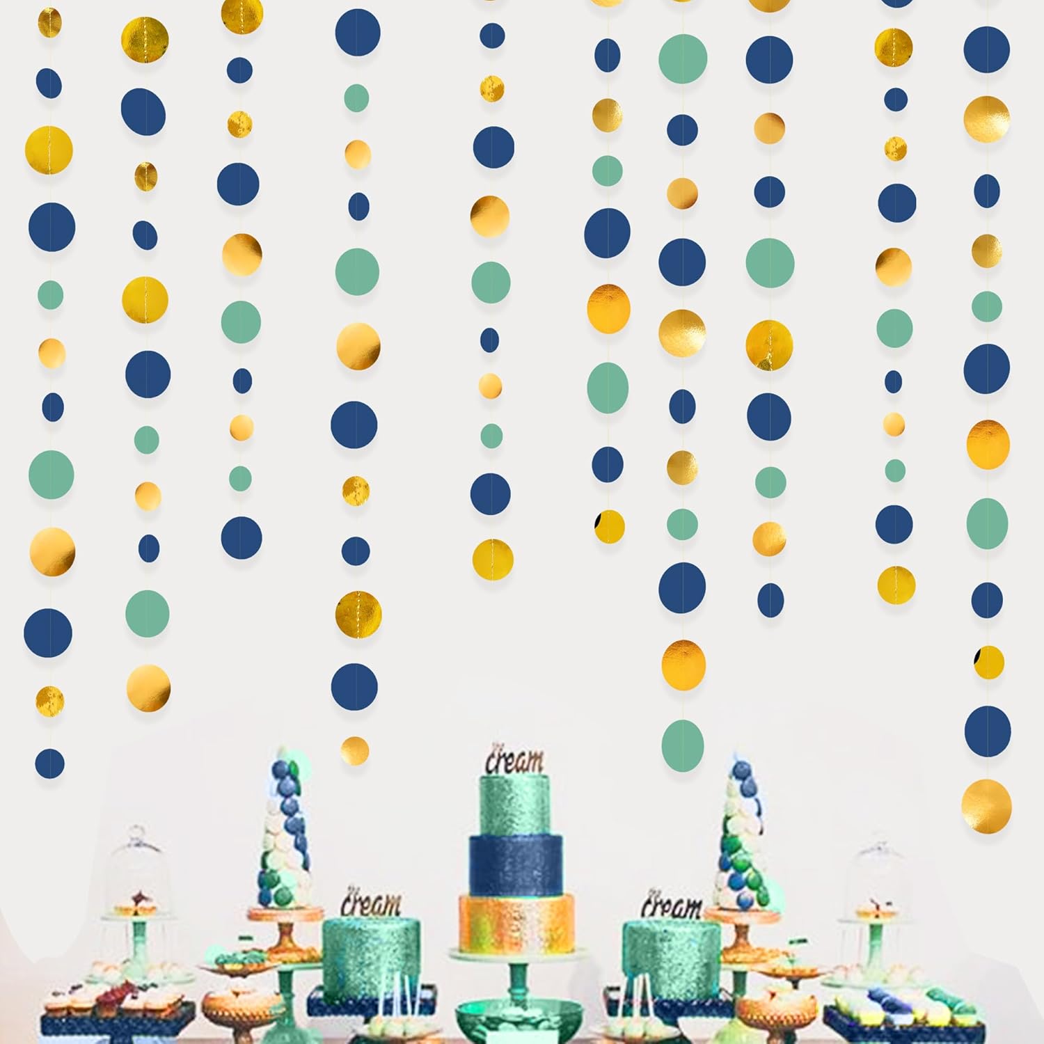 Blue Gold Green Decorations Circle Dots Garland Metallic Gold Navy Blue with Sage Green Hanging Polka Dot Streamer for Birthday Baby Shower Bridal Shower Wedding Bachelorette Engagement Party Supplies