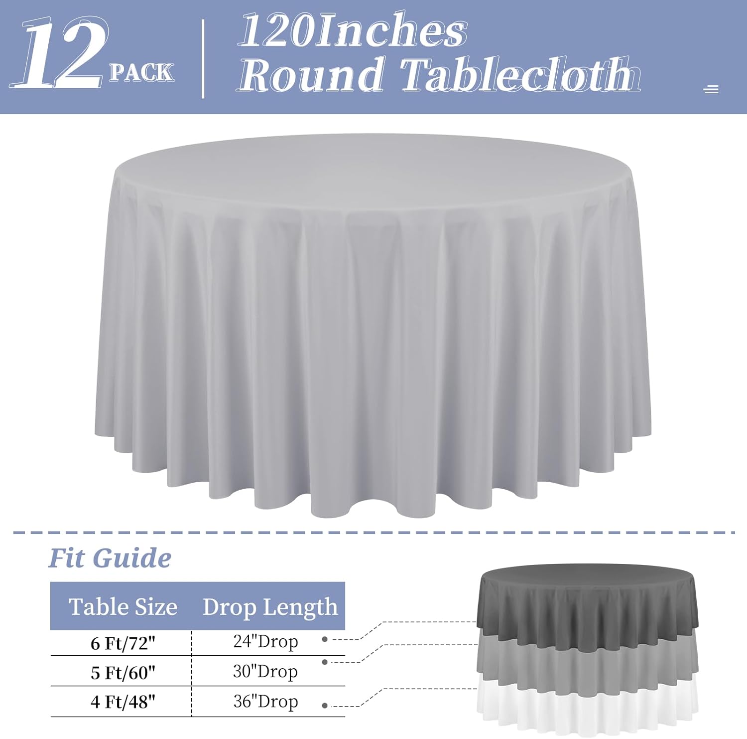 - 【Package Include】You will receive 12 packs of 120 inch light grey round polyester tablecloths, this 120 inch round tablecloth is Ideal for round tables. The product comes individually packaged in a re-sealable storage bag. Light grey tablecover is more luxurious, classic and gracious, ideal for both formal & casual settings.