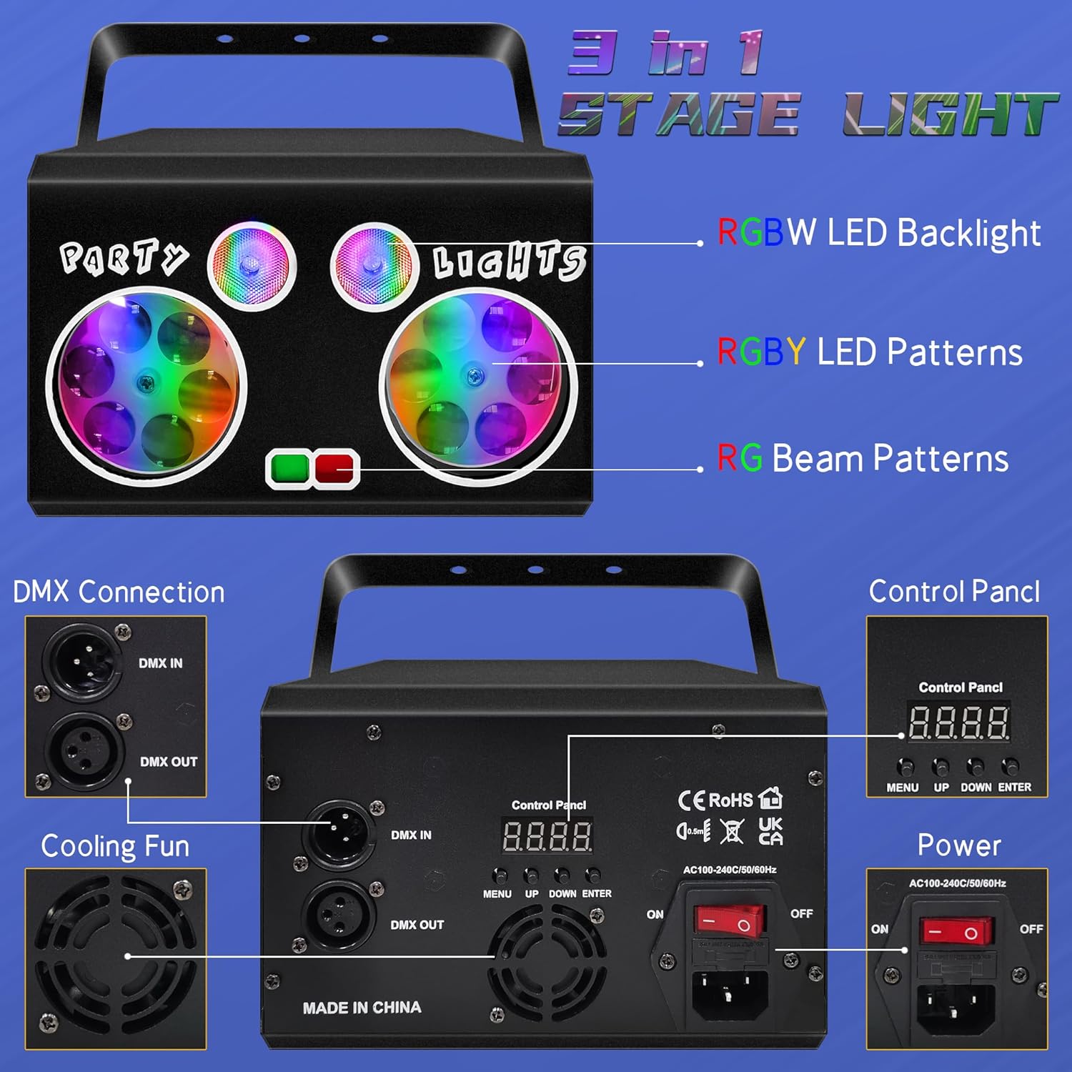 - 【Vibrant LED Patterns and Backlight Features】 Experience the brilliance of our Stage Light, offering a spectrum of LED patterns, beam modes, and captivating backlight effects. Watch as the light rotates and illuminates in vivid shades of red, green, blue, and yellow, creating mesmerizing visual displays. For an added dimension, integrate a fog machine to amplify the ambiance and captivate your audience.
