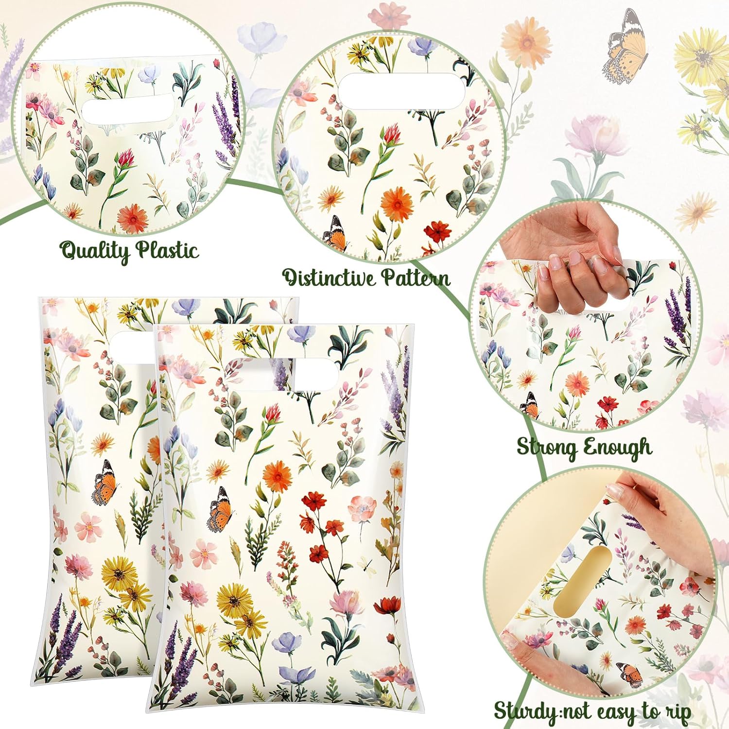 - Quality Material: our wildfloral baby shower bags are made with PE material, sturdy and reliable, not easy to break, ensuring durability and sturdiness to safely hold your gifts, and our floral plastic gift bag for mom equipped with handles, easy to use