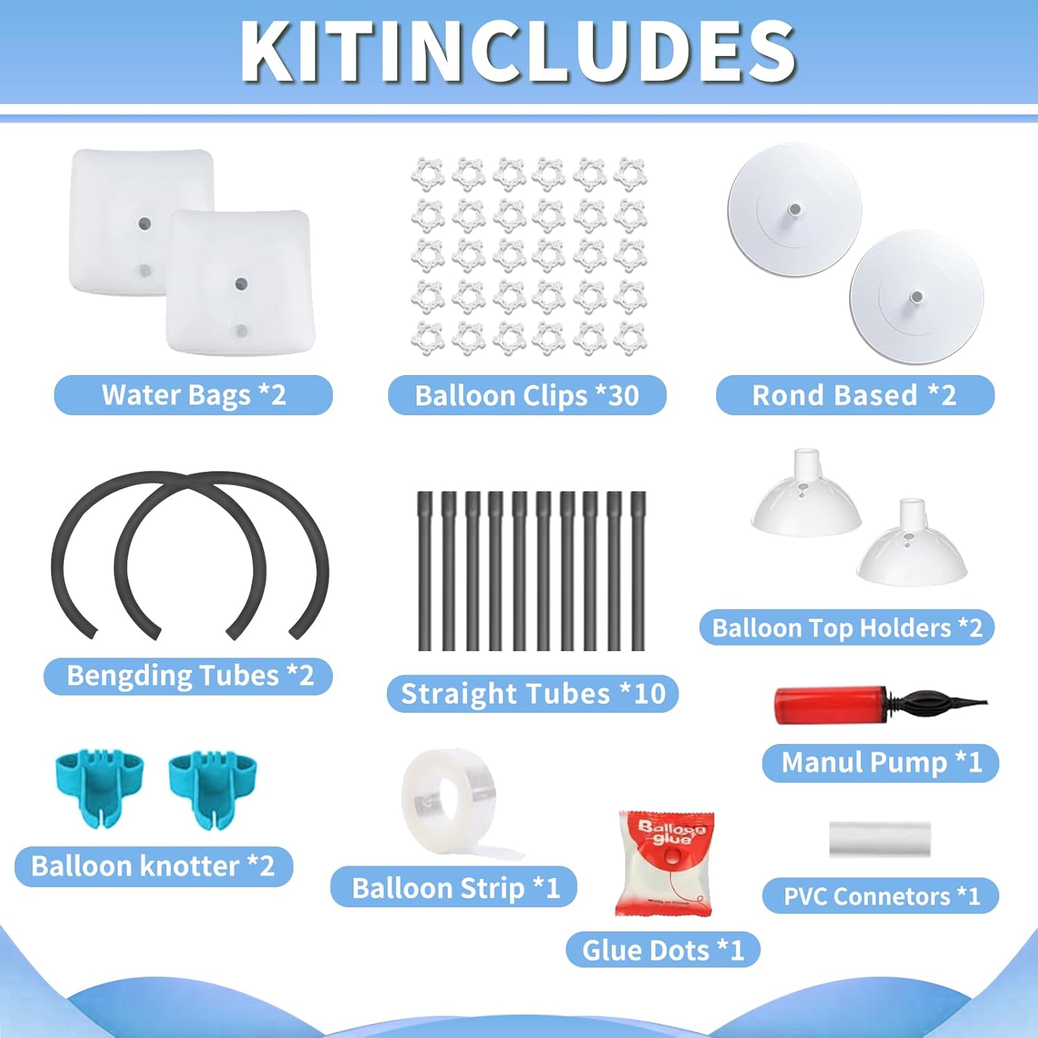 - ăAll-in-One KităOur balloon arch kit includes everything you need: 10 straight poles, 2 bendable top poles, 2 round bases, 2 water/sand bags, 30 balloon clips, 2 balloon top supports, 2 balloon knotters, 1 roll of glue dots, 1 balloon arch strip, 1 PVC connector, 1 manual pump, and detailed instructions.