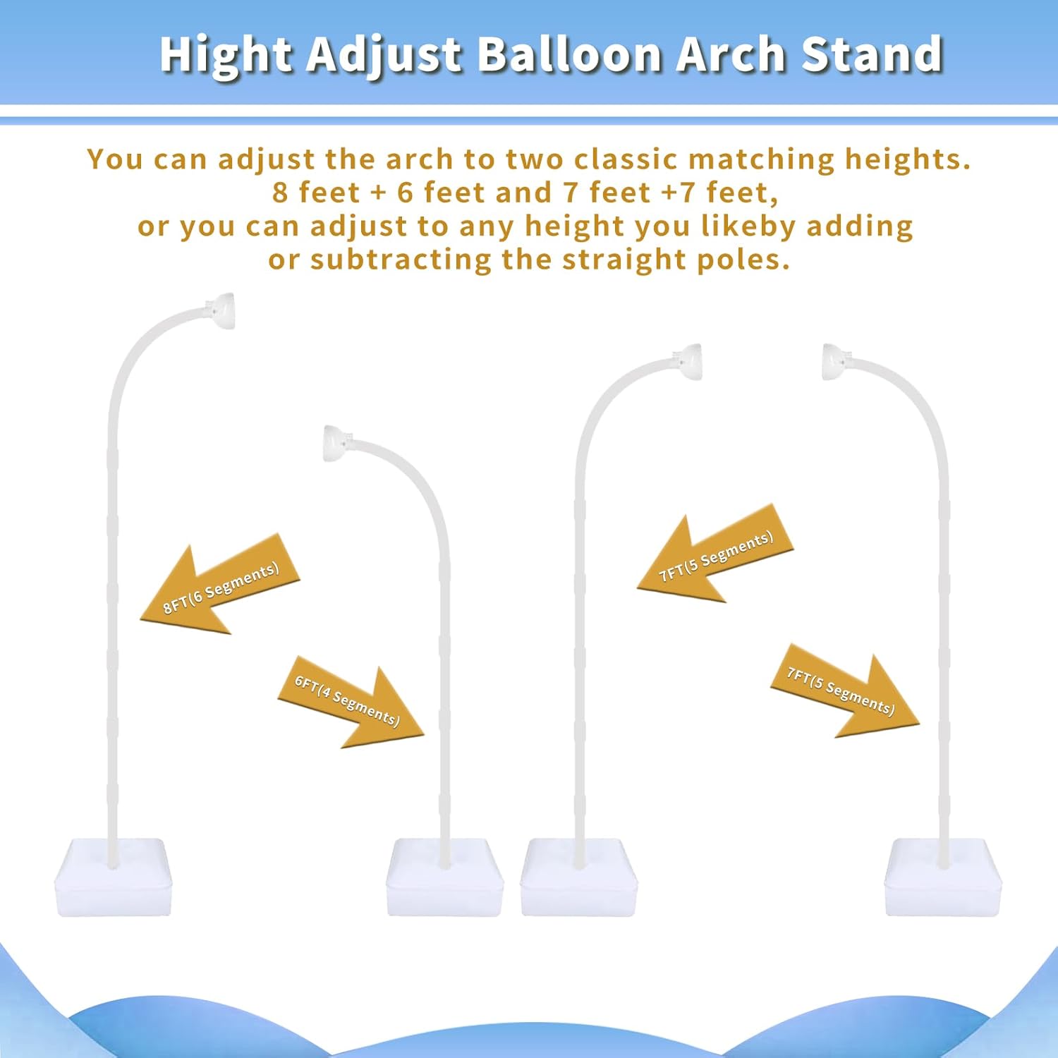 - ăFlexible and CustomizableăUnlike traditional round or square arches, our high plasticity tubes can be twisted and bent to create unique shapes such as circles, semi-circles, hearts, S-shapes, and balloon pillars. The top bendable poles can be adjusted to the shape you desire. You can adjust the arch to two heights: 8 FT + 6 FT and 7 FT + 7 FT, or to any height you like by adding or subtracting straight tubes, making it the highlight of any party.