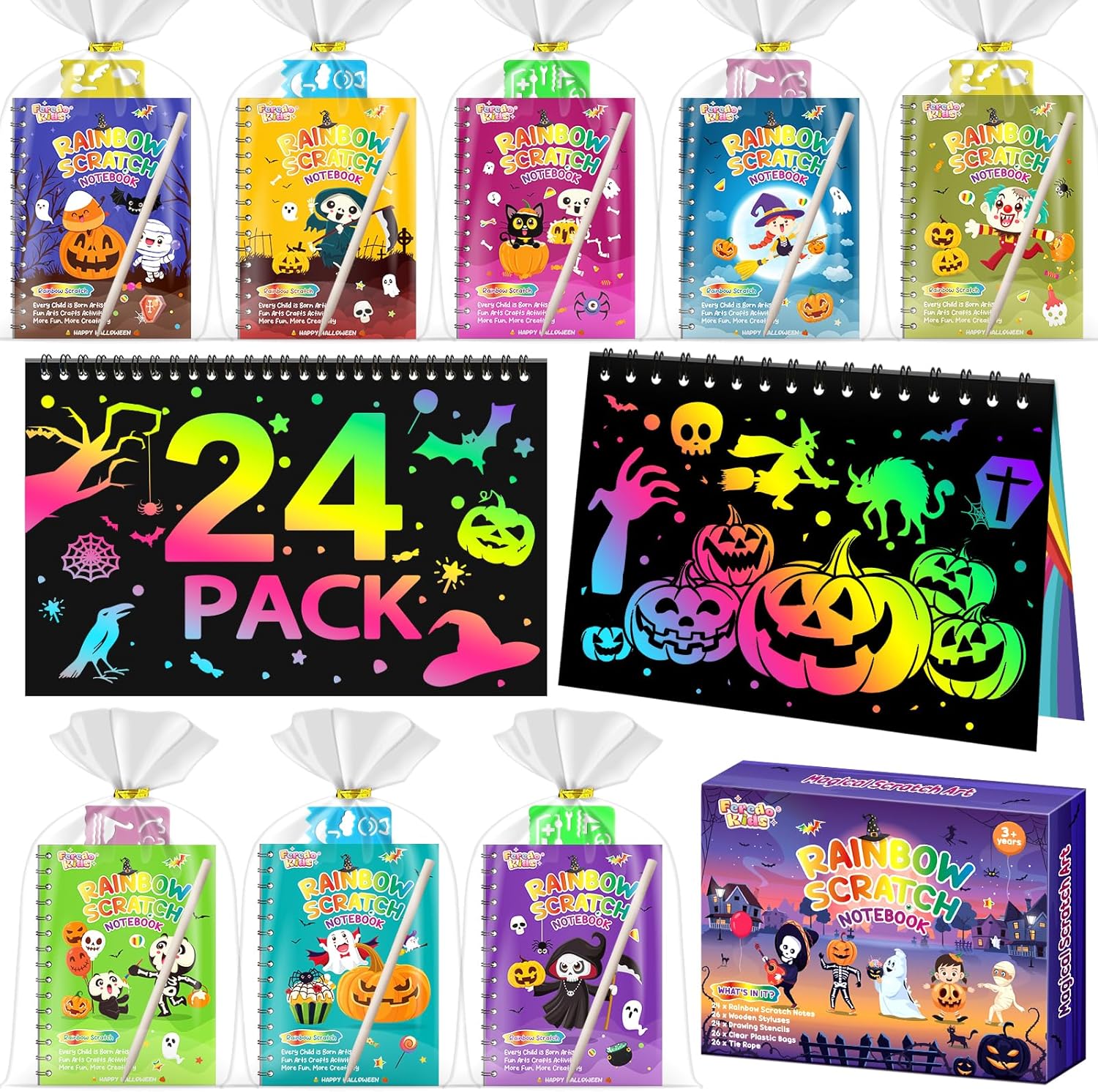- Halloween Scratch Art for Kids Kits - This scratch art includes 24 pack scratch notebook, 26pcs wooden styluses, 24pcs drawing stencils, 26pcs Gift bags and 1pcs gift box. Just scratch off the black coating on the drawing paper, and rainbow lines will appear. Children can also use the stencils to design more cute and funny shapes on the scraped paper to create colorful paper artworks.Adding a colorful touch to your scratch art themed party and other special occasions.