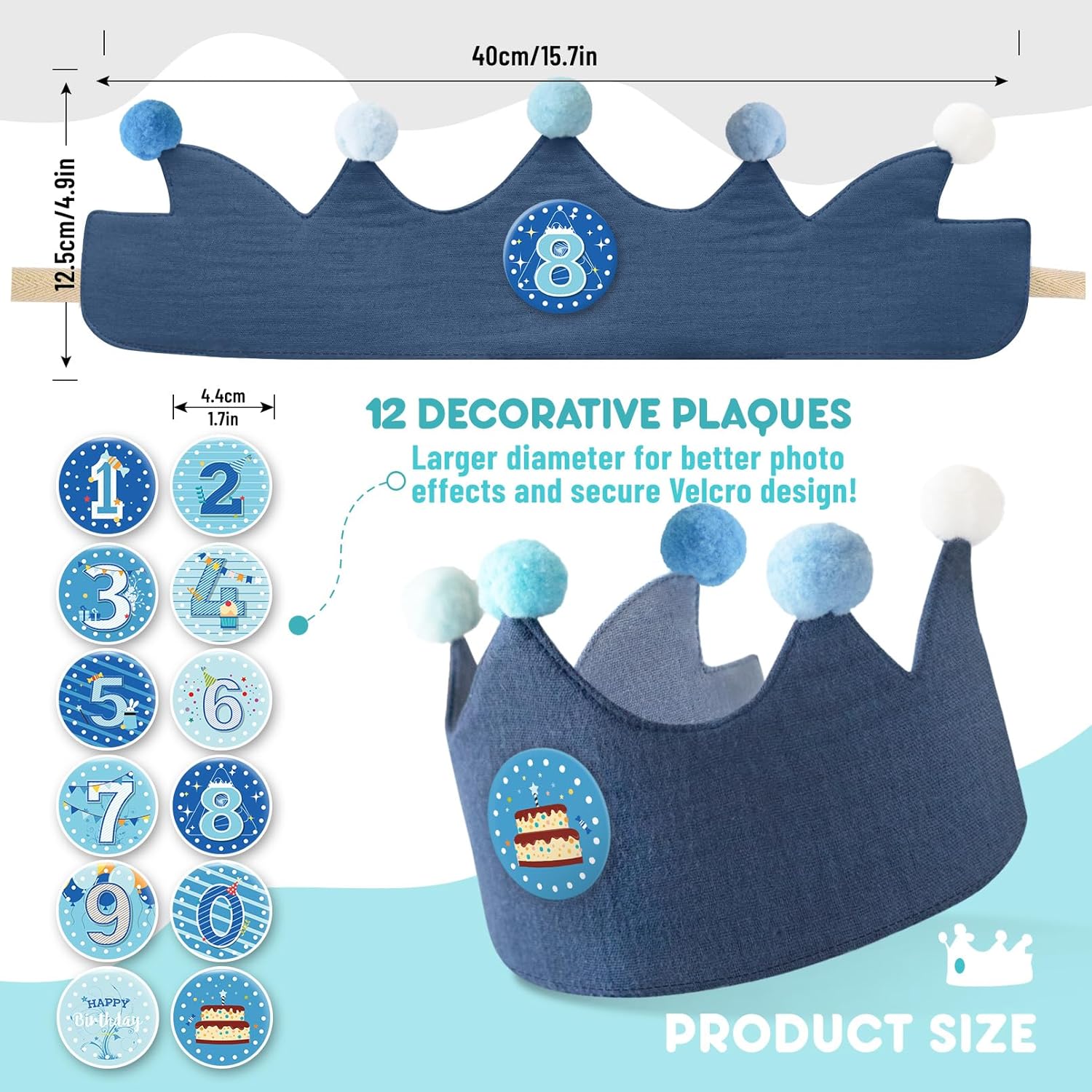 - 📸 Designed for Ages 0–9 – Make Your Little One the Center of Attention This birthday crown for boys features a unique curved design and an enlarged badge display area, making your child shine in every birthday photo. The included safe number patches for ages 0–9 are pin-free, making them especially suitable for babies and toddlers—safer for little ones, and more reassuring for parents