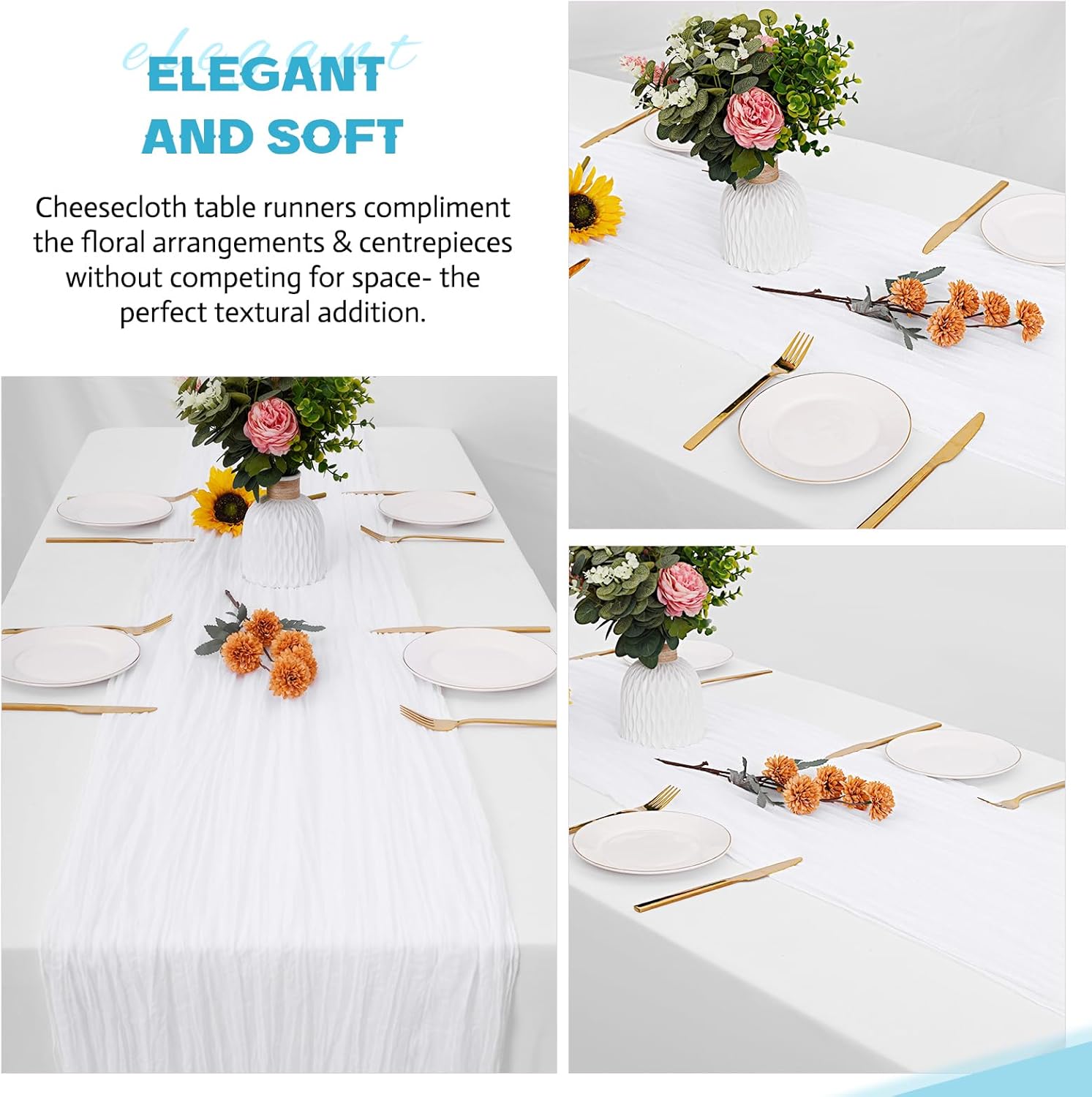 - 【Prefect Looking】 The cheesecloth table runners are an easy way to add texture to your table decor. They come twisted up, so when you unwrap them you can stretch and smooth them out as much as you'd like, or leave them more bunched and crinkly. These cheesecloth table runners compliment the floral arrangements & centerpieces without competing for space- the perfect textural addition.