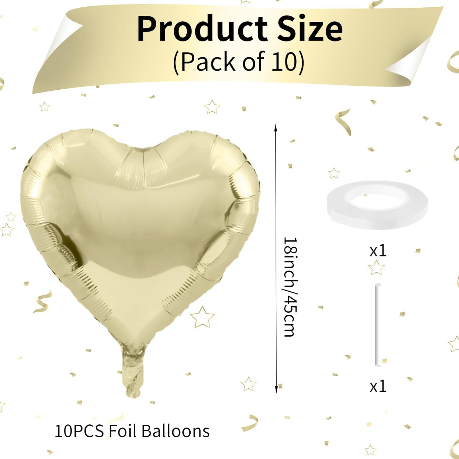 Pastel Gold Heart Balloons - 18 Inch Foil, 10 Pcs Love Balloons for Valentines Day, Birthday, Wedding, Bridal, Baby Shower Decorations
