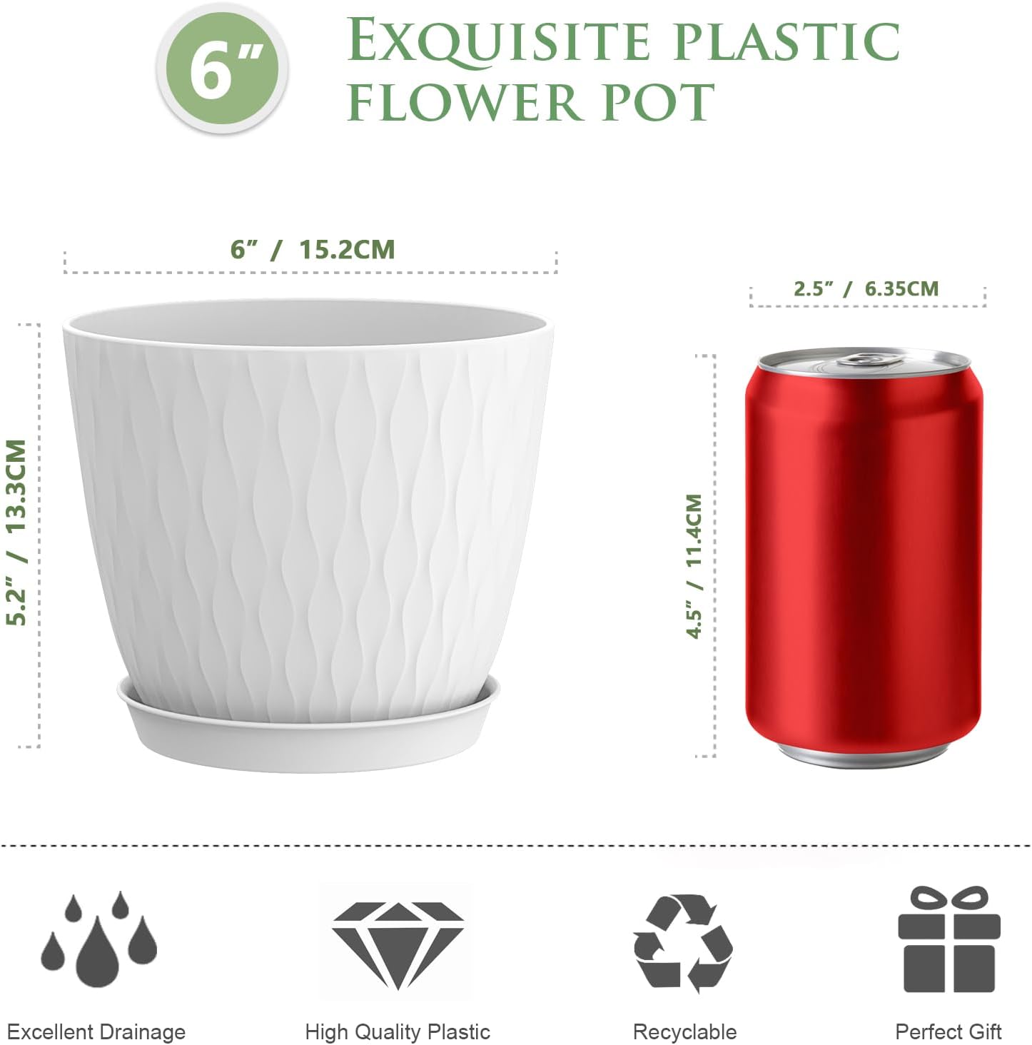 - 【Plant Pots with Drainage Holes and Saucers】Each plant pot features well-designed cyclone drainage holes at the bottom to ensure proper water flow. The flower pots don't clip into the saucers, just set in but we have a slightly raised design to allow water to drain.