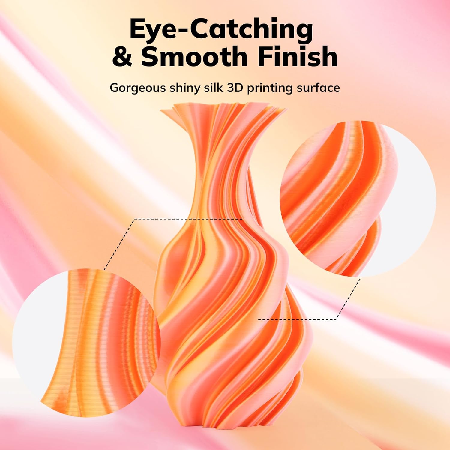 - Eye-catching Silk PLA: Shiny pink and orange combination of magic 1.75mm PLA filament, make the two sides of your print appear in different colors. Without polishing, you can get a silk glossy and smooth 3d prints. Beginner & expert friendly, it’s your go-to for eye-catching designs all year round