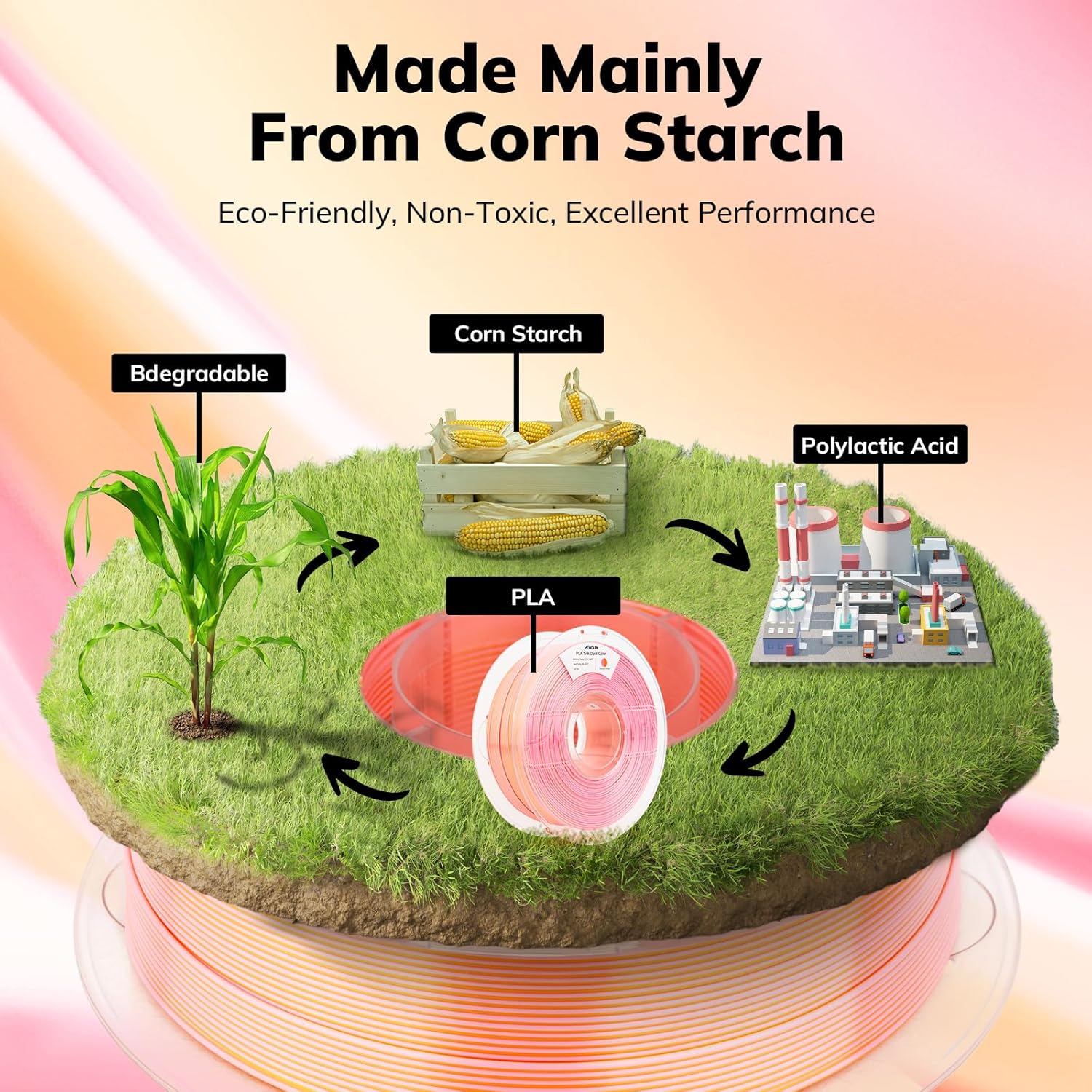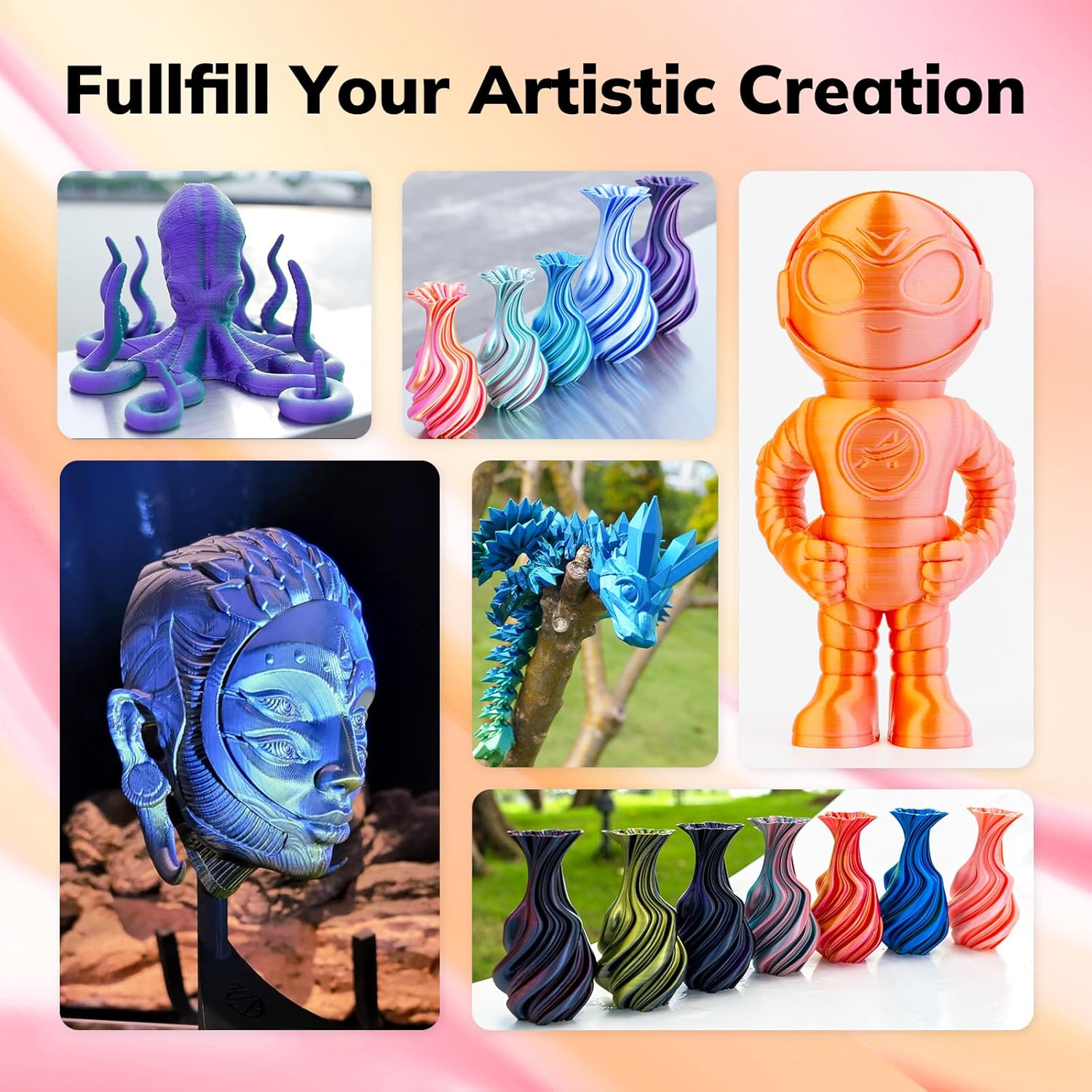 - Silk Dual Color PLA: Experiment with multiple hues without the commitment of larger spools. You can print beautiful multicolors in one PLA filament, perfect for arts, crafts, DIY. Whether you're crafting Easter decorations, designing Halloween costumes, creating Christmas ornaments, or making Valentine’s surprises, this filament delivers stunning results every time