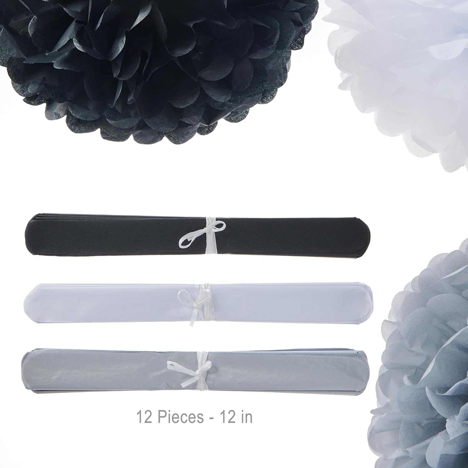 Tissue Pom Poms Tissue Paper Flowers Tissue Fluff Balls Party Decorations 12-Inch Pack of 12 (Black, White, Silver)