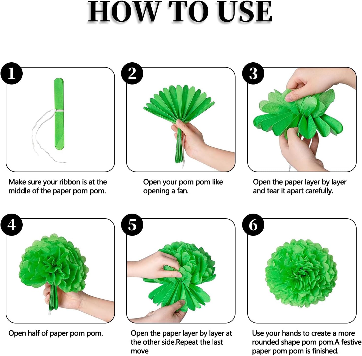 - 【DIY Hanging Pom Poms】These paper pom poms are shipped folded. Assembling requires time and patience to separate each paper layer and fluff. Each pom pom is individually packaged and is very easy to assemble to follow the instructions, begin by pulling from the outer edge and gently peeling away each tissue paper layer. With delicate strokes, fluff the pom pom into a rounded shape.