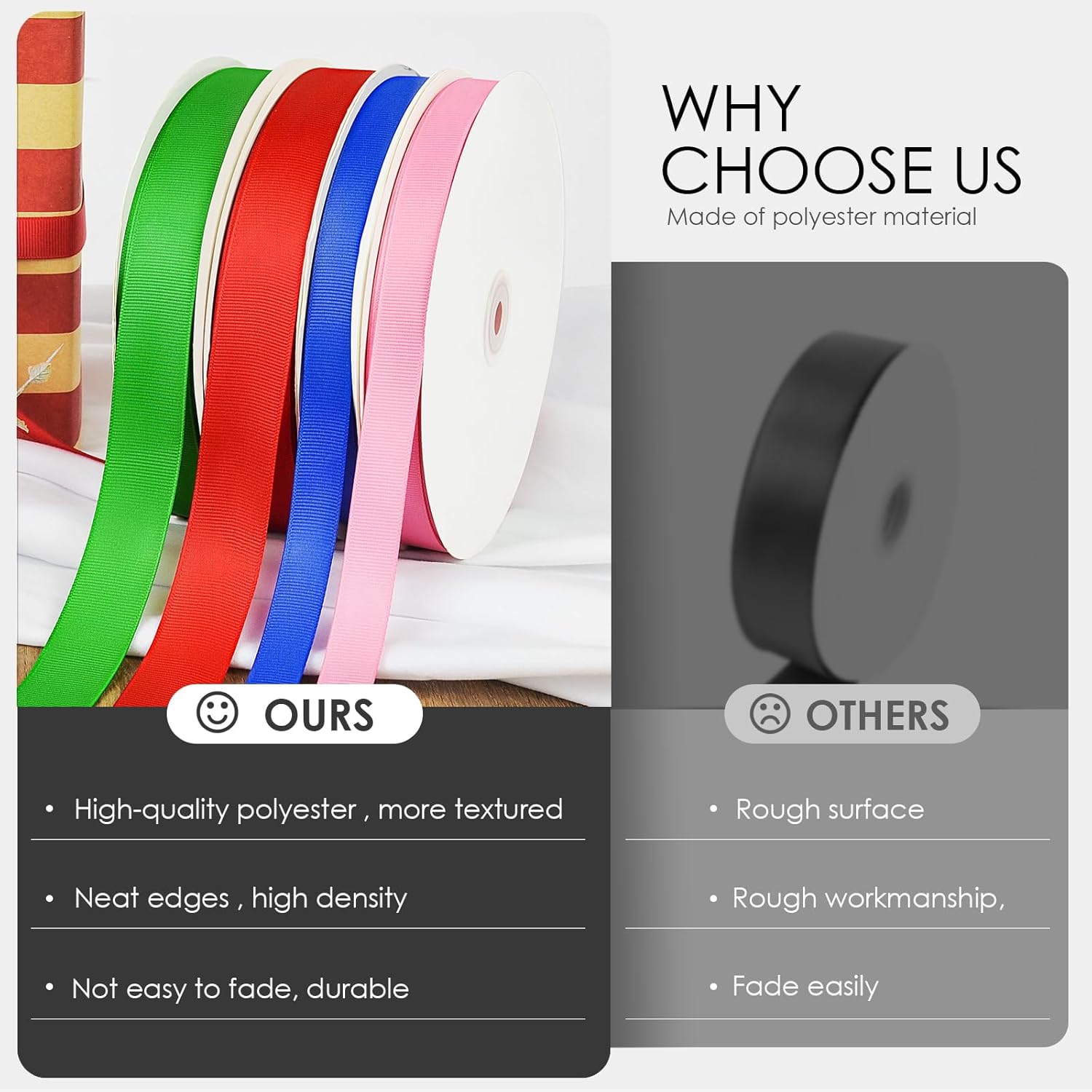 - HIGH QUALITY: VISPAD grosgrain ribbon, 100% polyester fabric ribbon. The surface is smooth and comfortable to the touch, perfect choice for gift and craft ribbons.