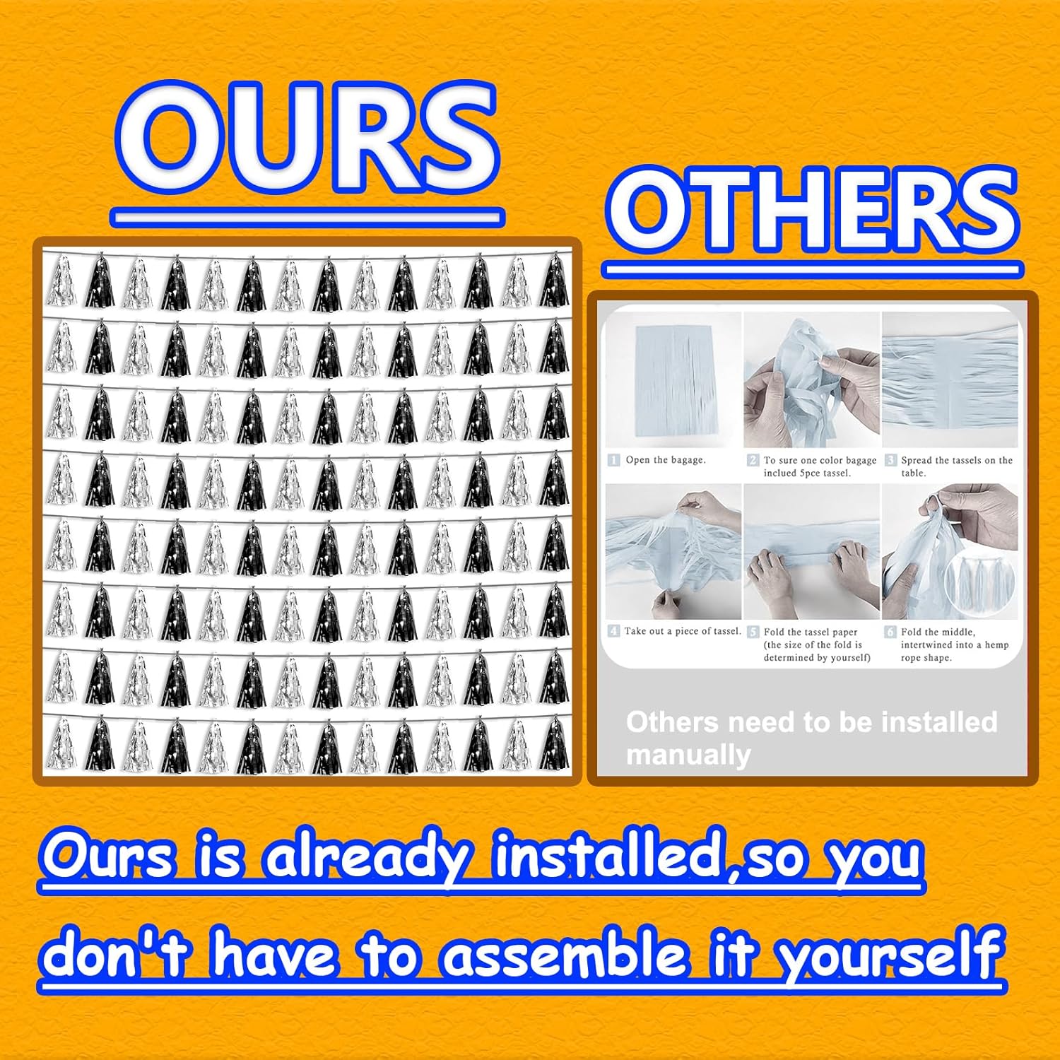 - 【Black Silver Beige Mint Gold Party Supplies Set】: The total length of the Black Silver beige mint gold birthday tassels banner is 78.7 feet, divided into 8 strips, each 9.8 feet long. Each banner contains 15 tassels, and each tassel measures 14 inches, for birthday decorations many occasions, and so on