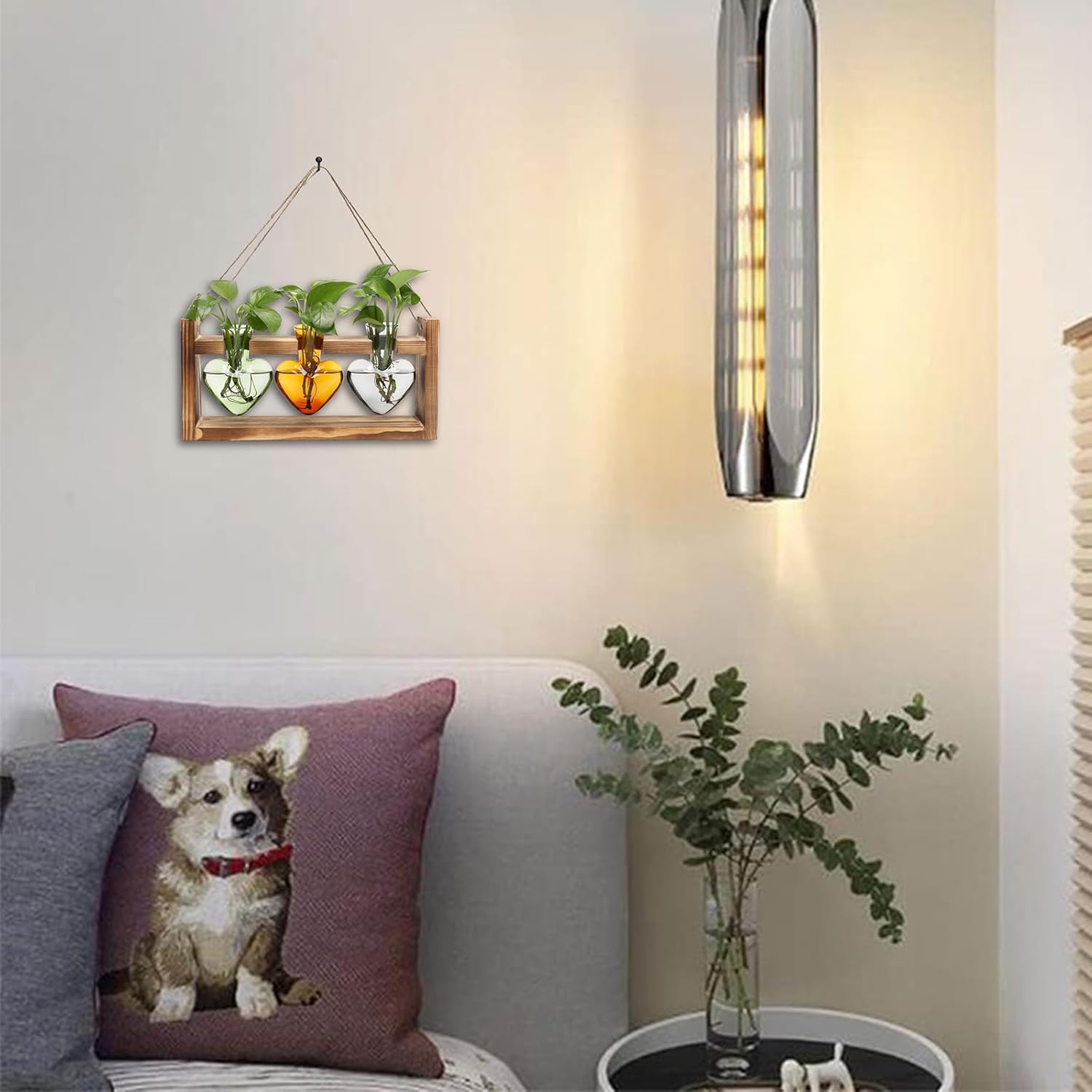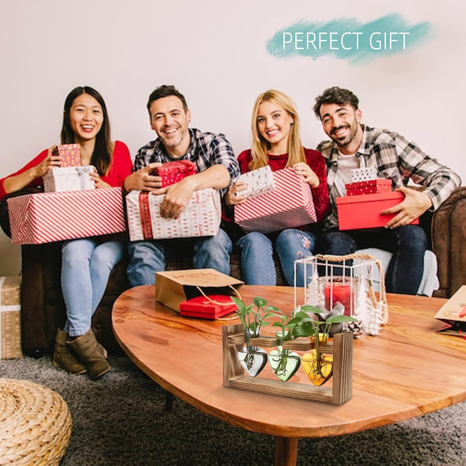 Plant Terrarium Propagation Stations Hydroponics Home Garden Decoration Gift for Women with Wooden Stand Heart Shaped Colored Glass Vase