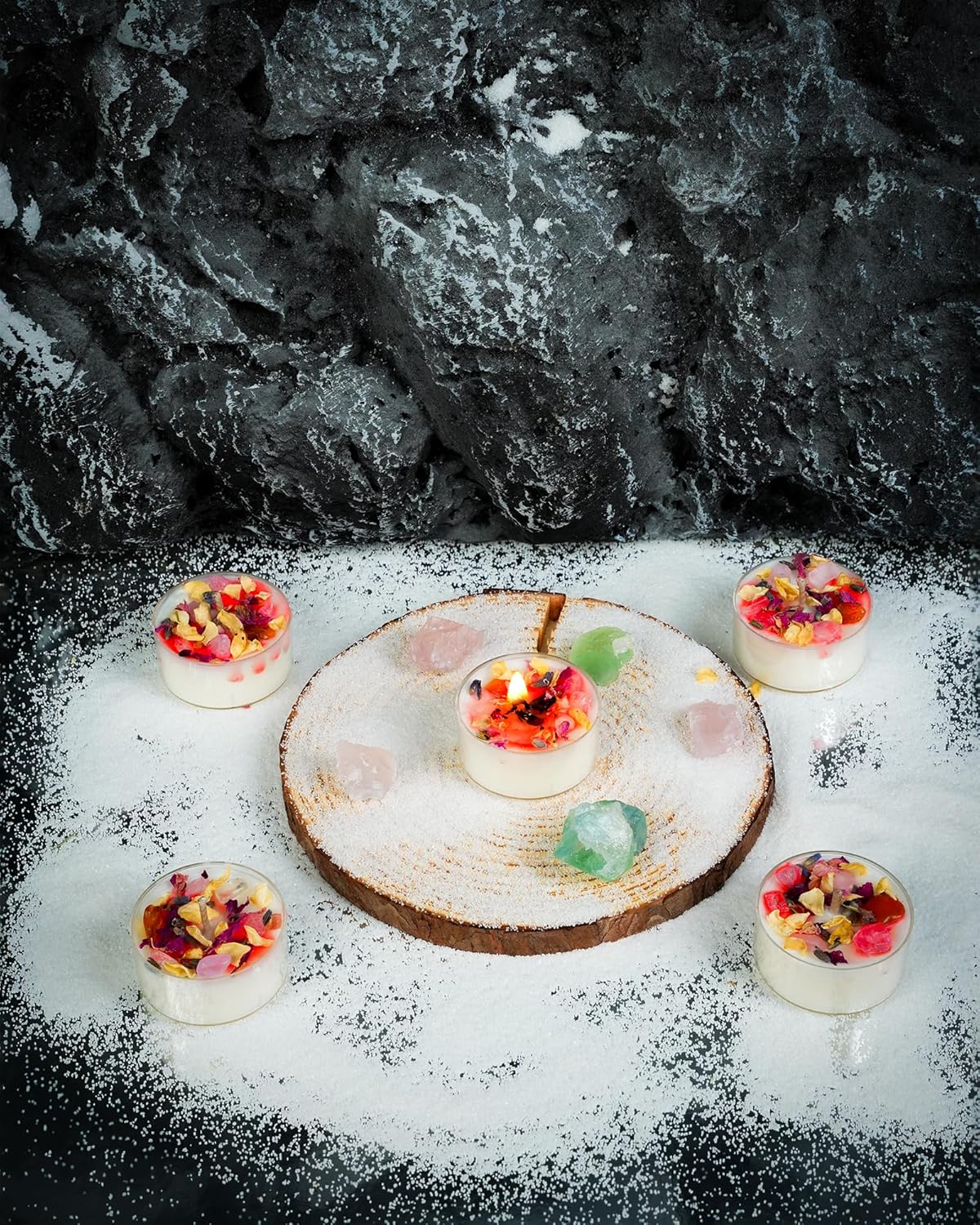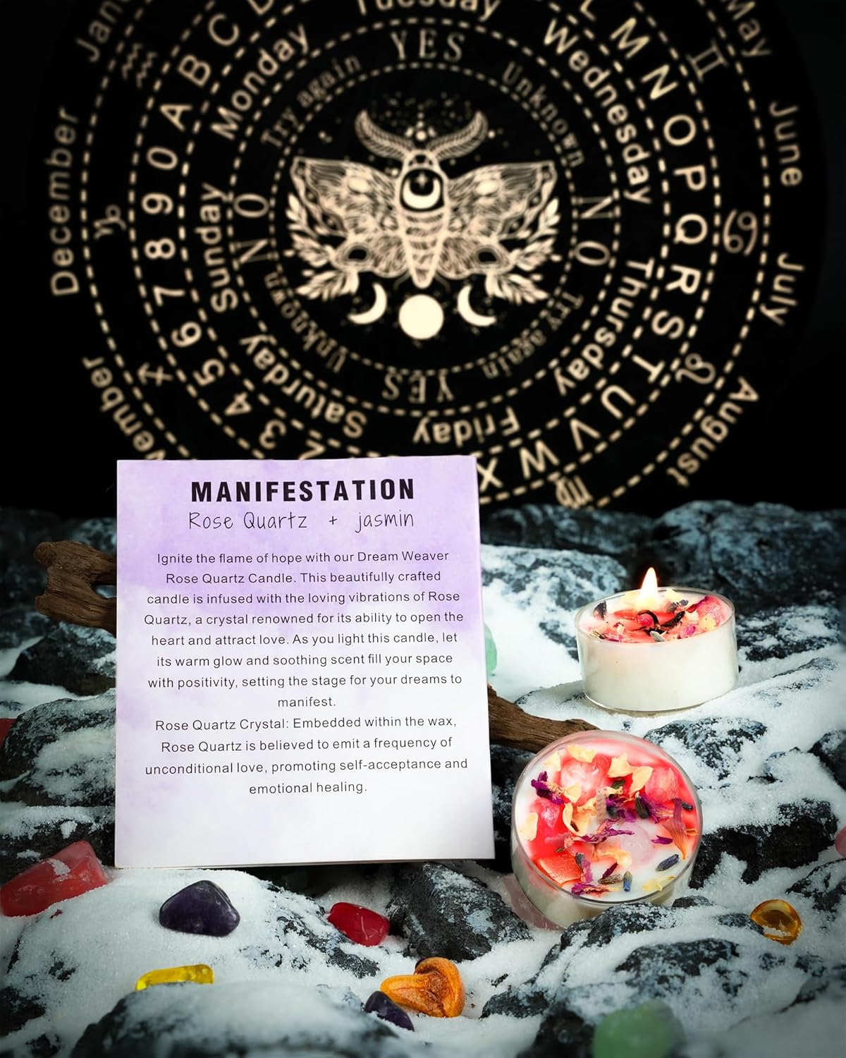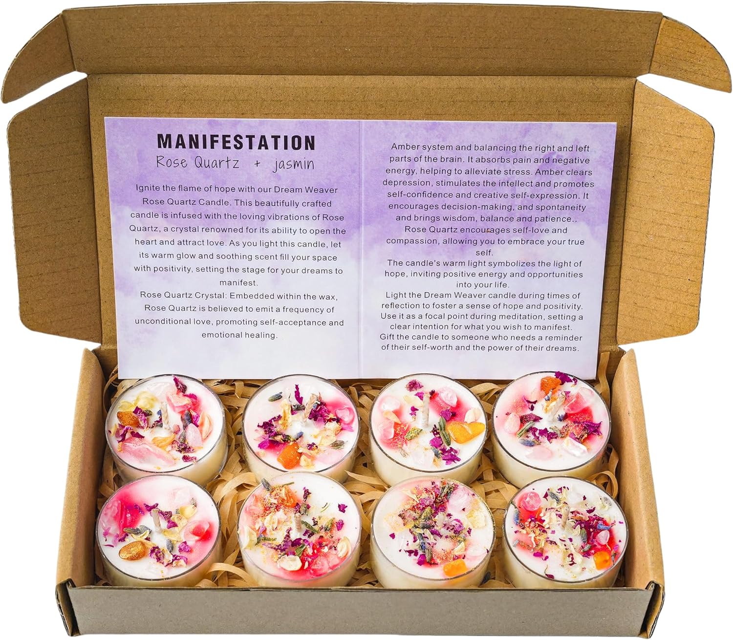 - Tea Lights 8 Candle Set: rose + quartzite + jasmine + lavender set. Fulfill all your wishes with rose quartz infused 11:11 manifesting candles and a great gift for candle lovers!