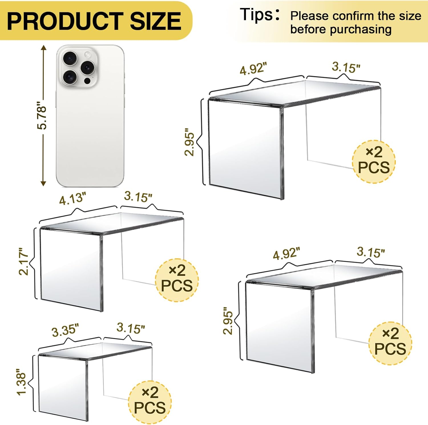 - SIZES INCLUDED: Four sizes of clear shelf risers (two acrylic display risers in each size), including 8 clear display shelves, the sizes are 3.3*3.1*1.3 inches, 4.1*3.1*2.1 inches, 4.9*3.1*2.9 inches and 5.7*3.1*3.7 inches. The 4 different heights of acrylic display risers can be displayed together like steps, arranged separately, or staggered to display your collections