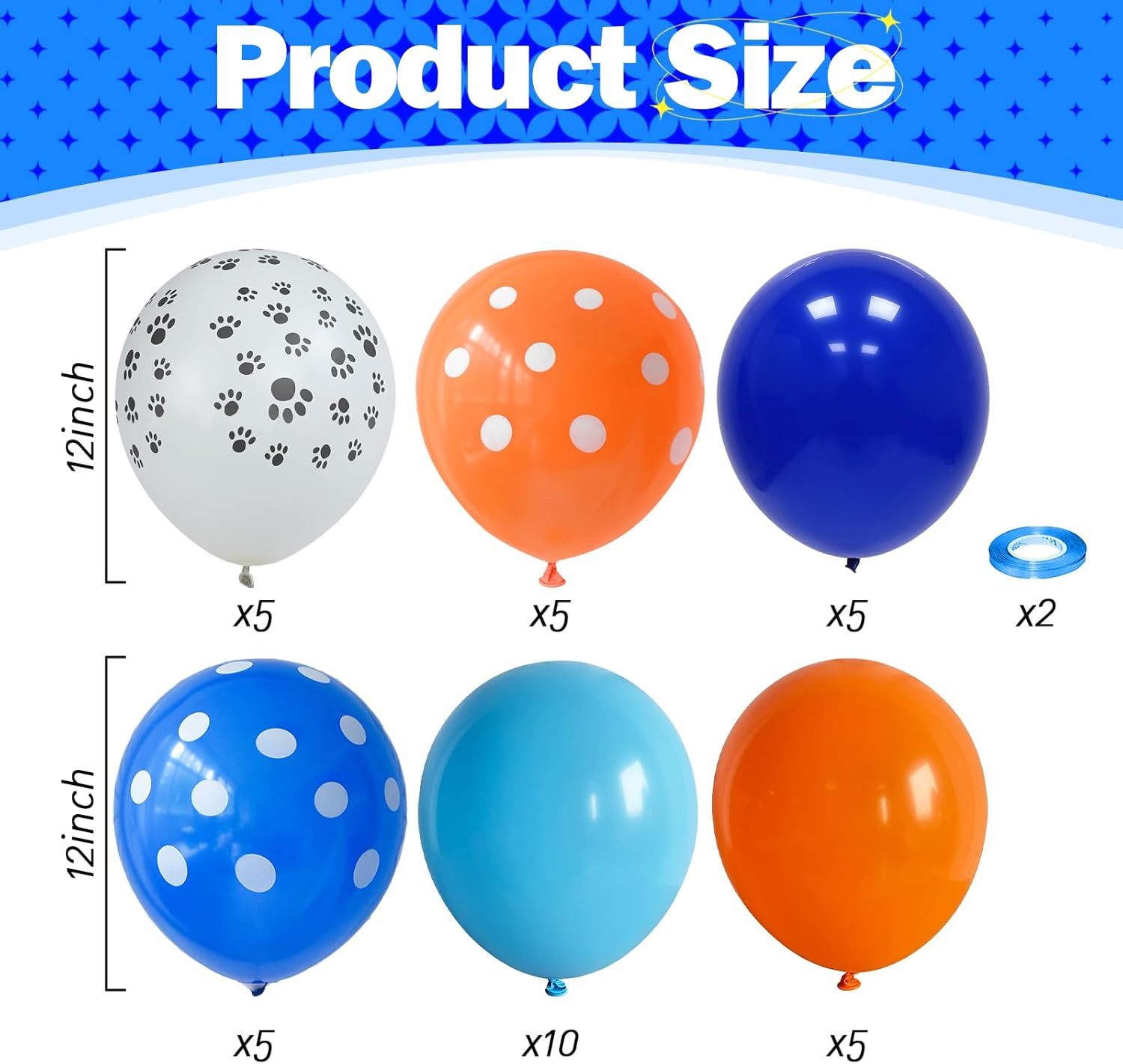 - 𦴠Blue and Orange Balloons Set: This is a beautiful bright balloon, which contains balloons of different colors. Include 12 inch dog paw print balloon(5pcs), light blue balloon(10pcs), royal blue balloon(5pcs), orange balloon(5pcs), orange white print balloon(5pcs), dark blue white print balloon(5pcs), 2 rolls of ribbons. You can use these different shades of blue and orange balloon kits, DIY balloon combinations to create your birthday party.