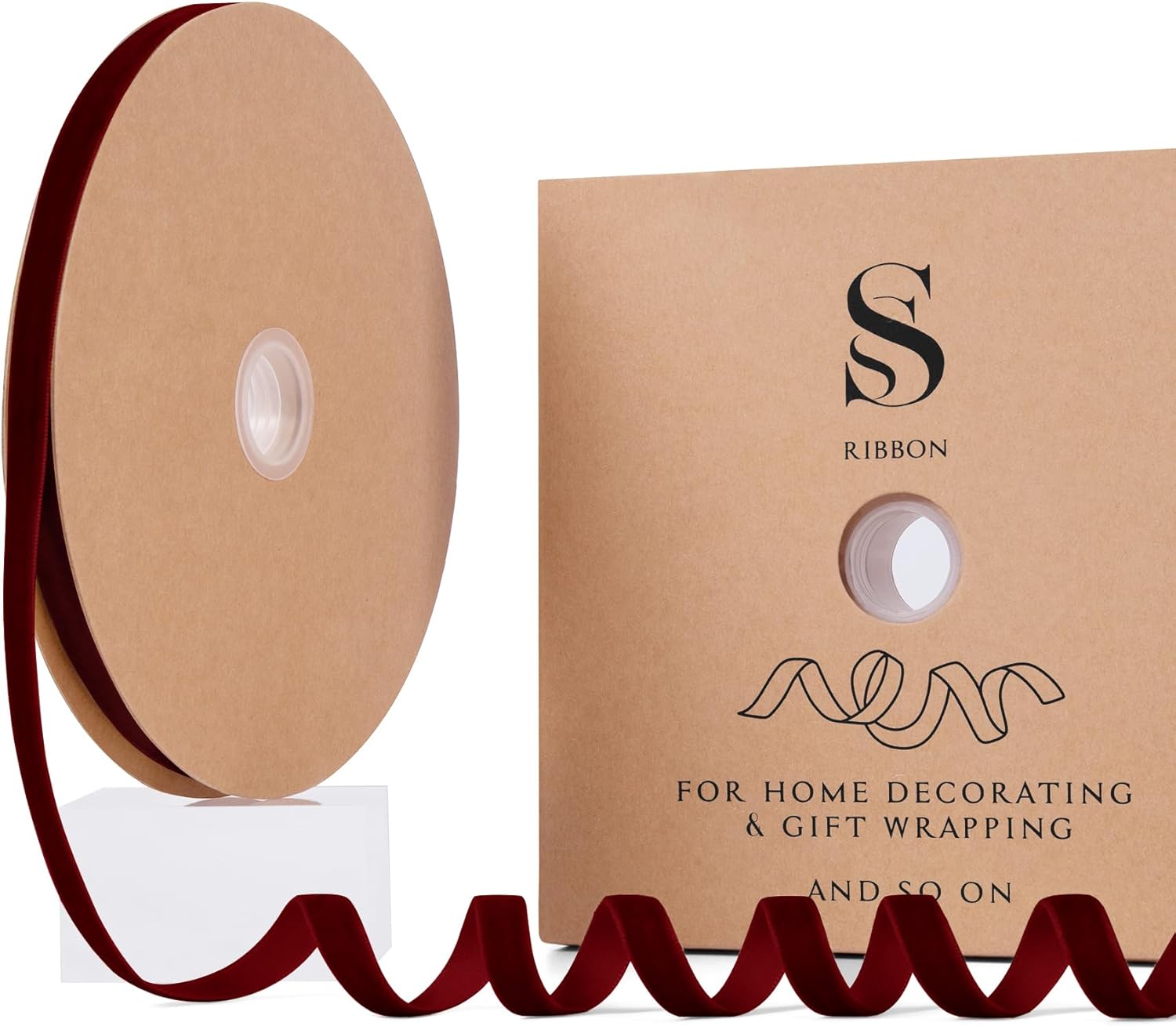 Burgundy Christmas Velvet Ribbon for Tree, Gift Wrapping, Flower Bouquet, Wreath Decorations, Bow Making 3/8'', 25 Yards