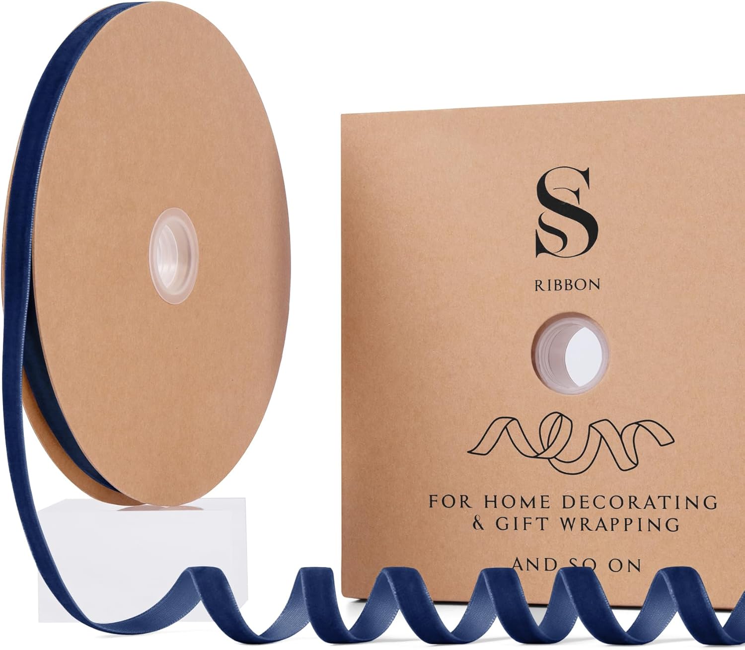 Navy Blue Christmas Velvet Ribbon for Tree, Gift Wrapping, Flower Bouquet, Wreath Decorations, Bow Making 3/8'', 25 Yards