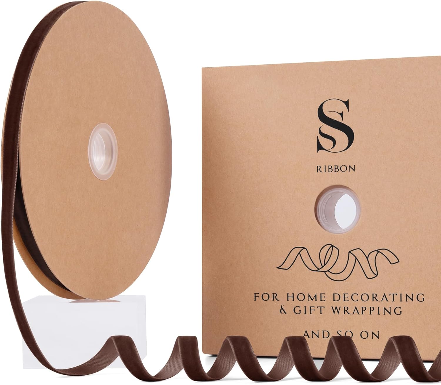 Brown Christmas Velvet Ribbon for Tree, Gift Wrapping, Flower Bouquet, Wreath Decorations, Bow Making 3/8'', 25 Yards