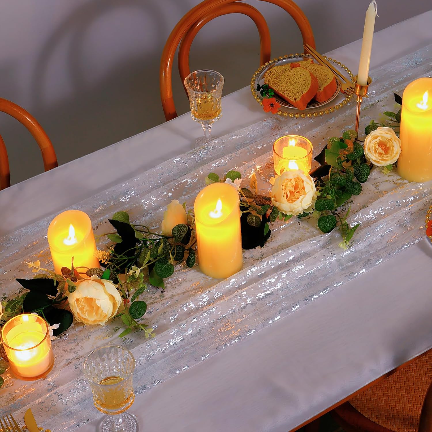 - 【Premium Table Runner】Our silver sheer table runners are made of high quality polyester with metallic silver foil. With premium workmanship, our table covers are wear and tear resistant, not easy to fade, resistant to water, oil, stain. And its sturdily construction makes the table runner long-lasting.