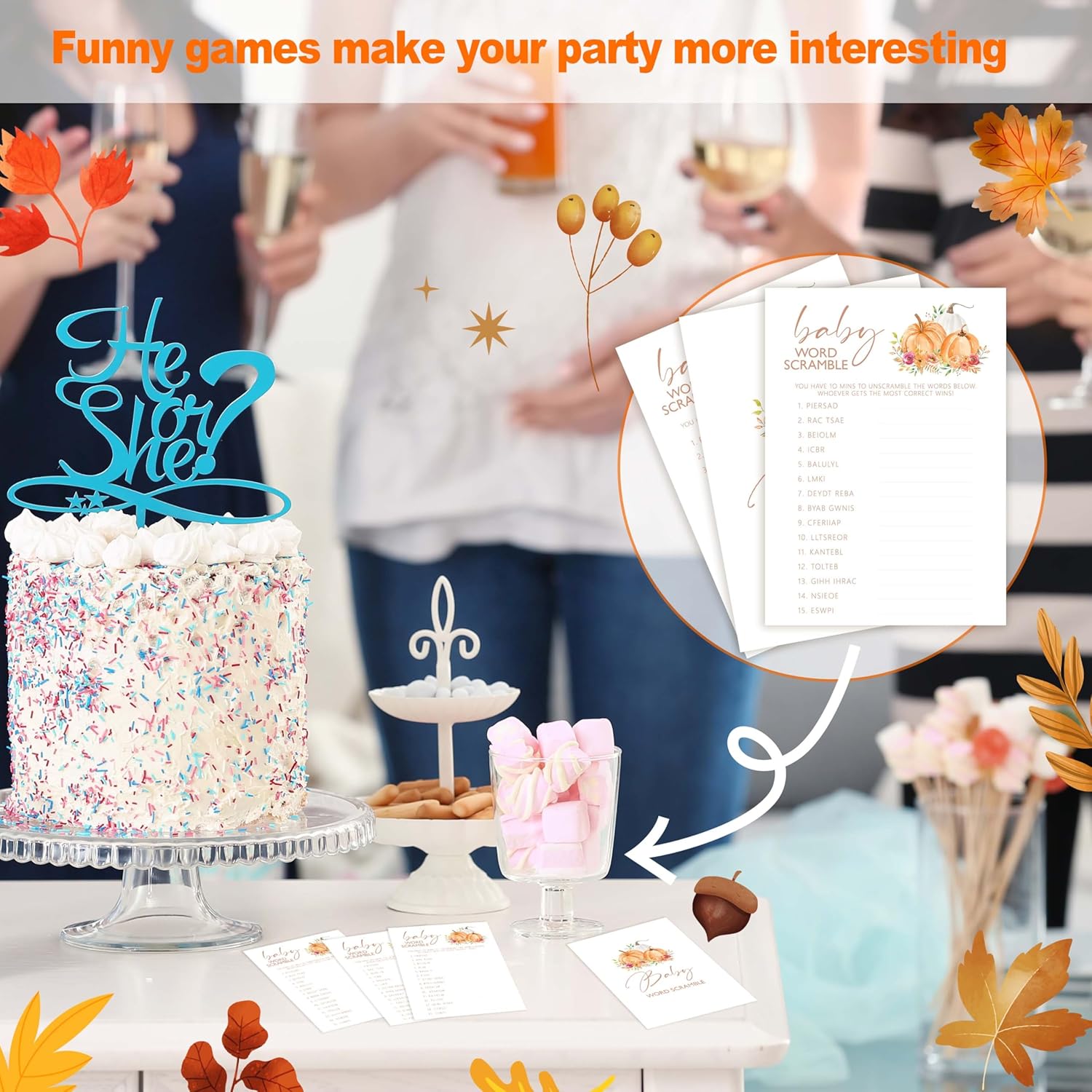 Baby Shower Games, Thanksgiving Baby Word Scramble + 1 Answer Card, 25 Sets Baby Gender Reveal Party Decorations Supplies - E07