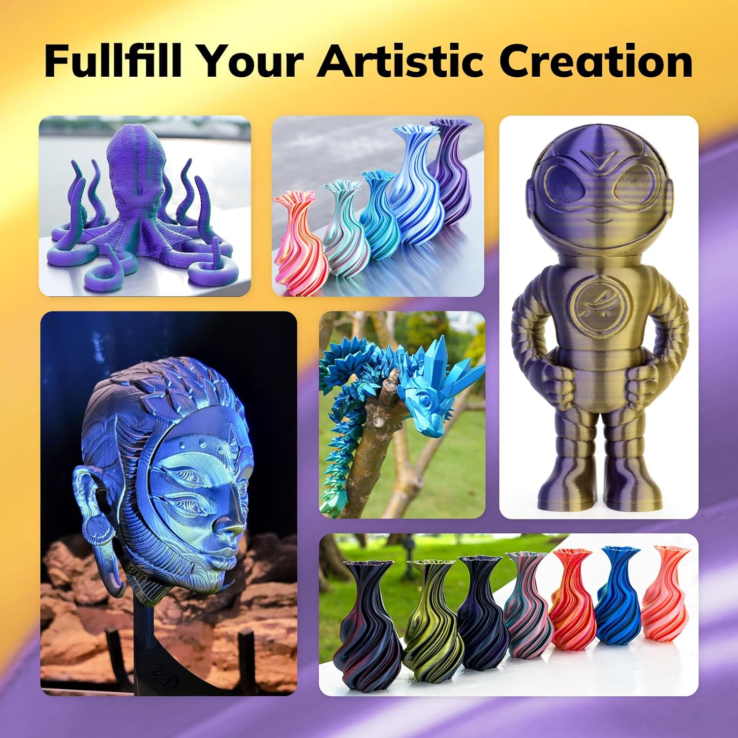 - Silk Dual Color PLA: Experiment with multiple hues without the commitment of larger spools. You can print beautiful multicolors in one PLA filament, perfect for arts, crafts, DIY. Whether you're crafting Easter decorations, designing Halloween costumes, creating Christmas ornaments, or making Valentine’s surprises, this filament delivers stunning results every time
