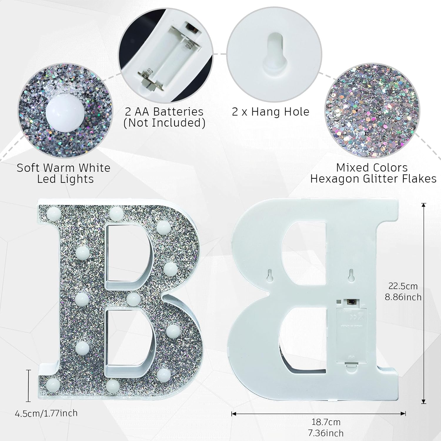 - π‘ Elegant Glitter Light-Up Letters with Silver Diamond Finish: These LED marquee light up letters feature a stunning glitter effect combined with a sophisticated silver diamond surface. Including all 26 alphabet letters and 10 numbers, these light up letters bring sparkle and elegance to any space, making them the perfect light letters for party decor, especially as light up letters for table settings or wall accents.