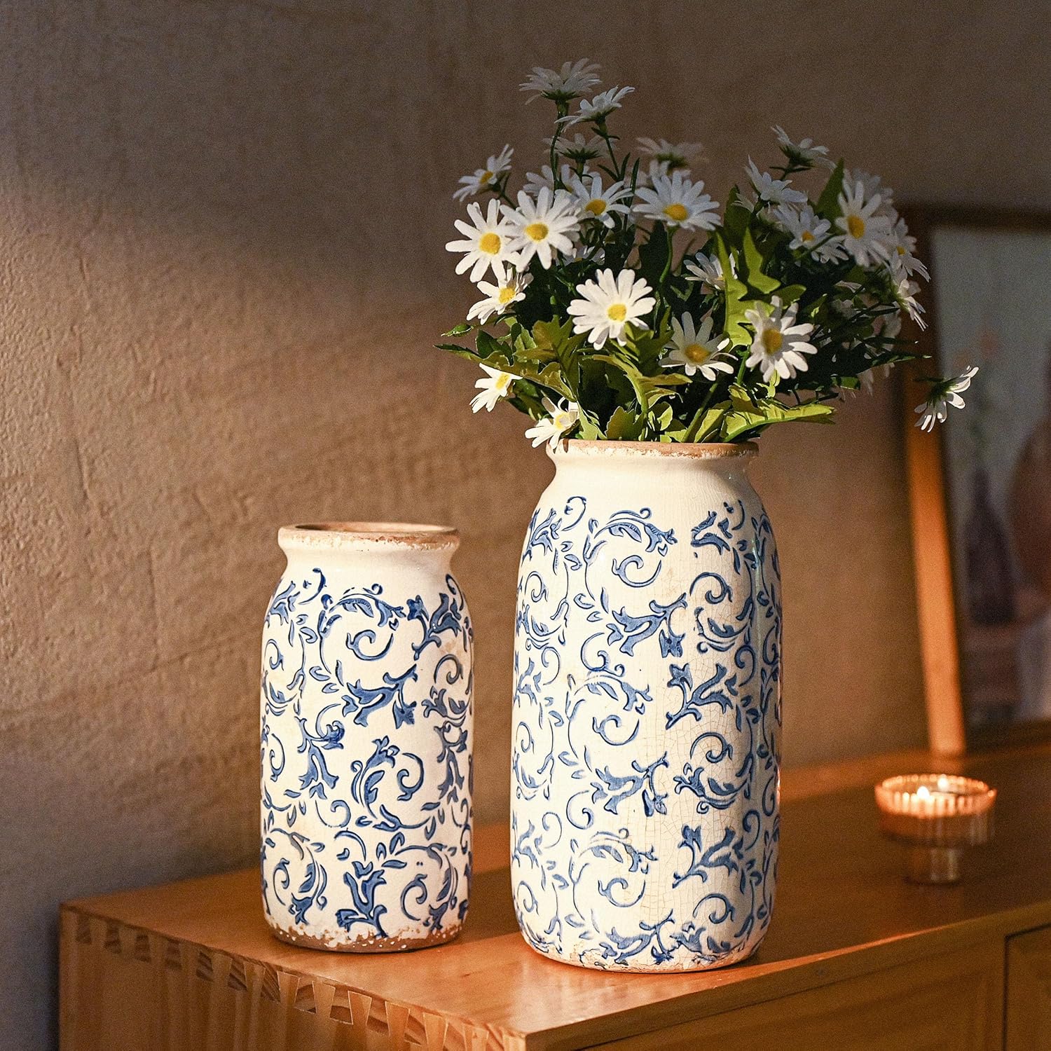 VICTOR & TERESA Rustic Blue and White Vase for Home Decor, Ceramic Vases for Flowers, Modern Farmhouse Decorative Vases for Pampas Grass,Table, Mantel, Living Room,Bookshelf, Centerpieces, 8''