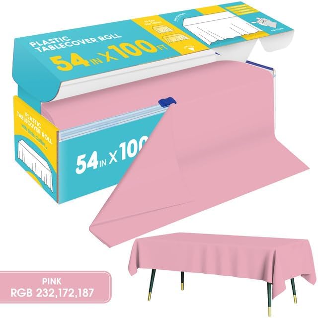 Pink Plastic Table Cover Roll - 54IN x 100FT, Table Cloth for Rectangle Table with Slide Cutter, Plastic Table Cloth Disposable with Cut-to-Size Design for Weddings, Banquets, Parties