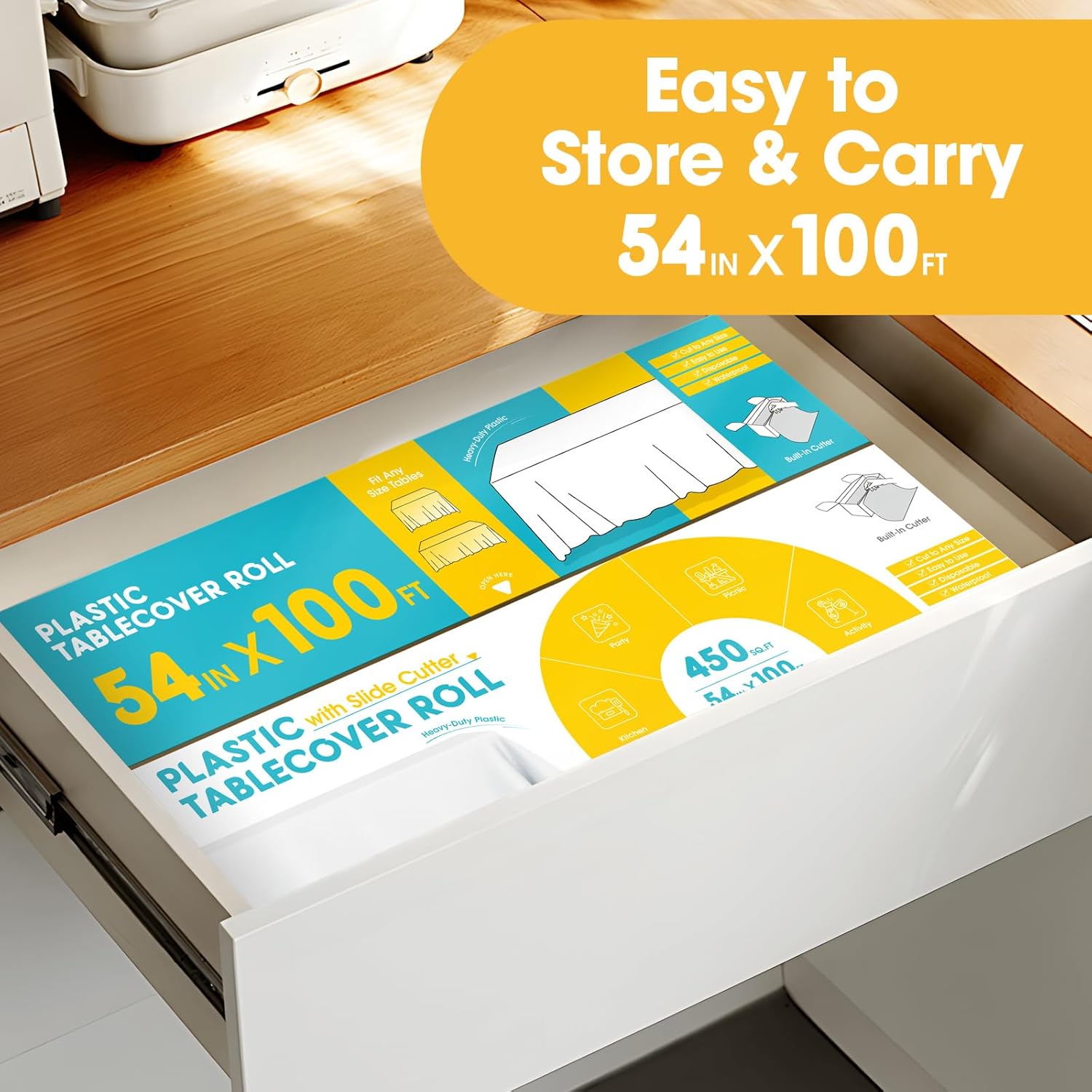 - SPACE-SAVING & PORTABLE: The Niuara rectangle tablecloth roll is neatly packed in a compact box with a slide cutter. Its slim design makes it easy to store without taking up too much space. This table cover for party effortlessly fits in a party supply closet, a kitchen drawer, or a car trunk. Just take and use it anytime and anywhere.