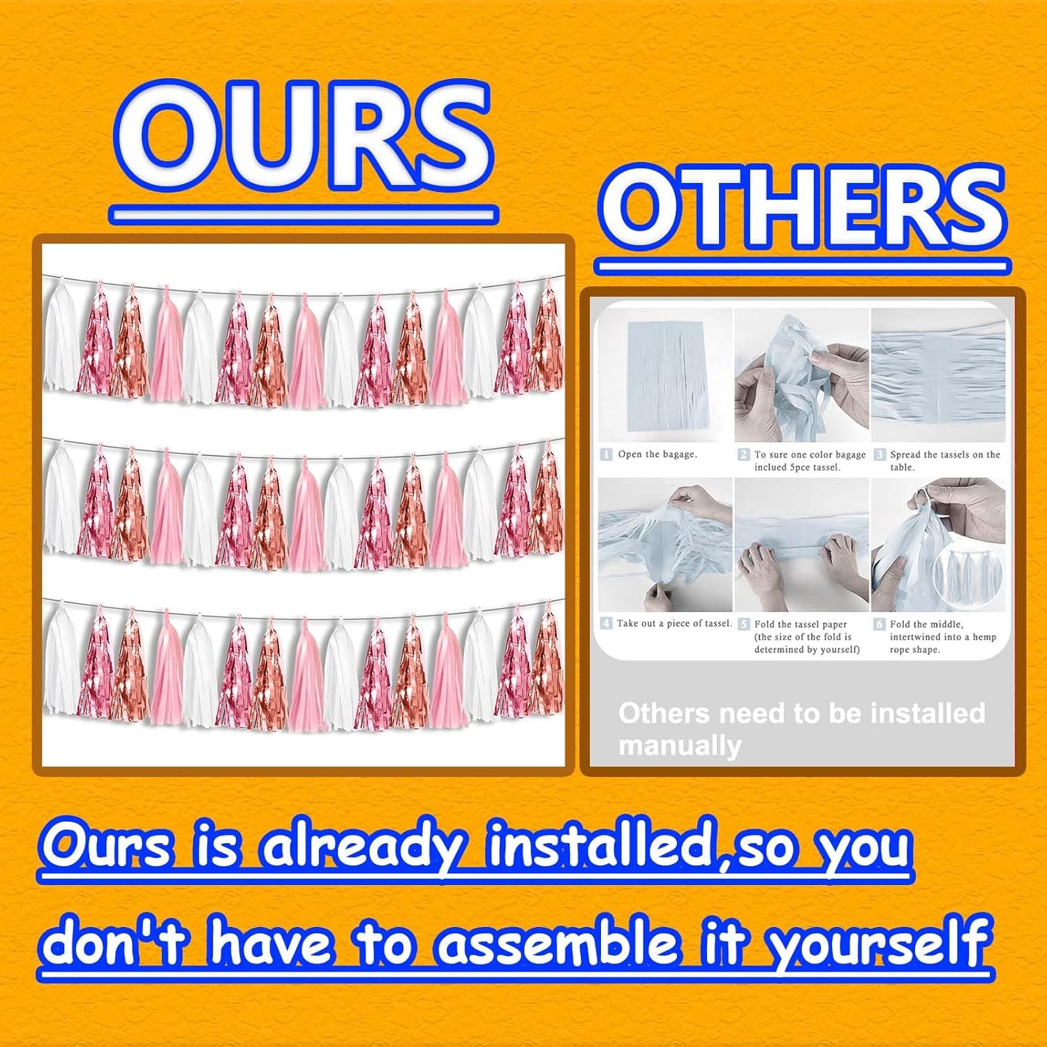 - 【Premium Reusable Tassel Material】: Our glitter fringe garland is made of high-quality PET material, with the virtue of nice craftsmanship and light weight which is safe and recyclable. And the smooth touch makes tassels easy to tidy up. They come with white ribbon for hanging, and garland tassels hang perpendicular to the string, and are adjustable to provide you with the option of spreading the tassels out or piecing them closer together.