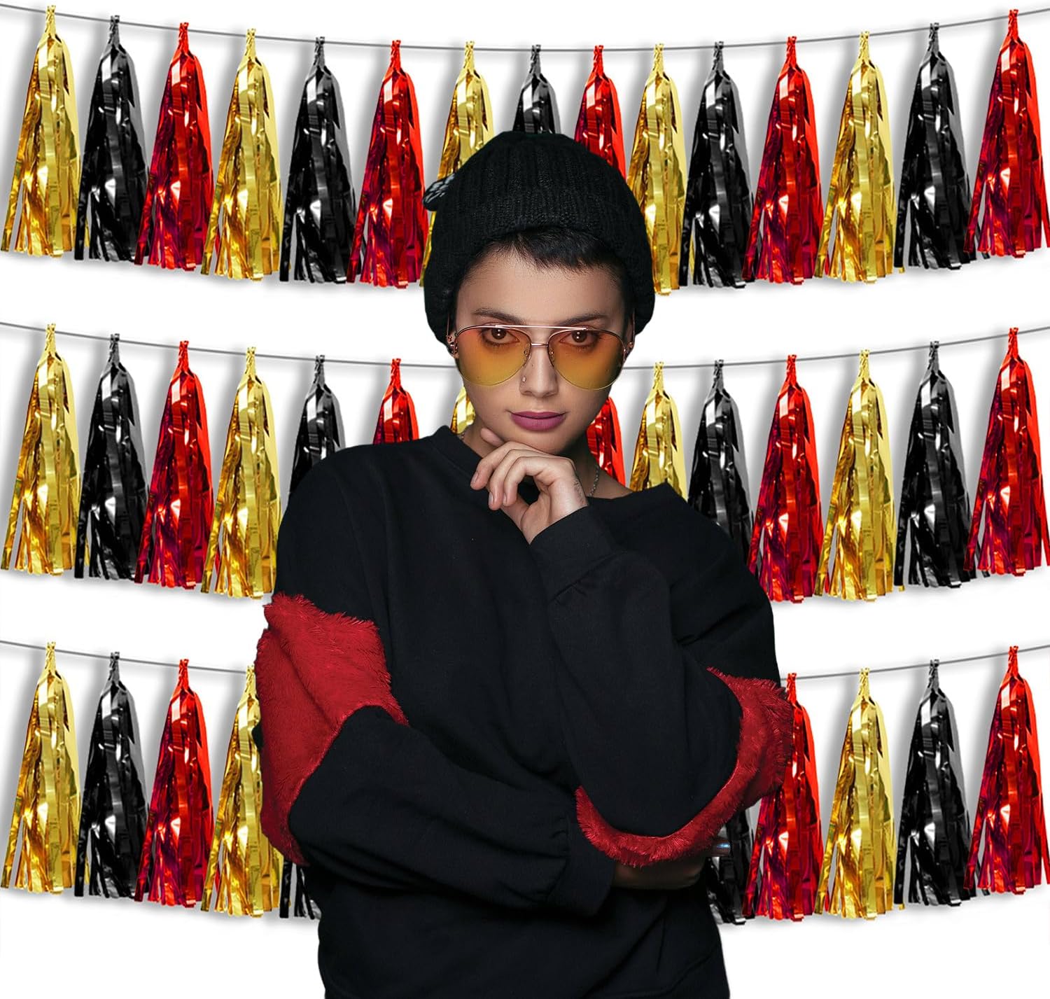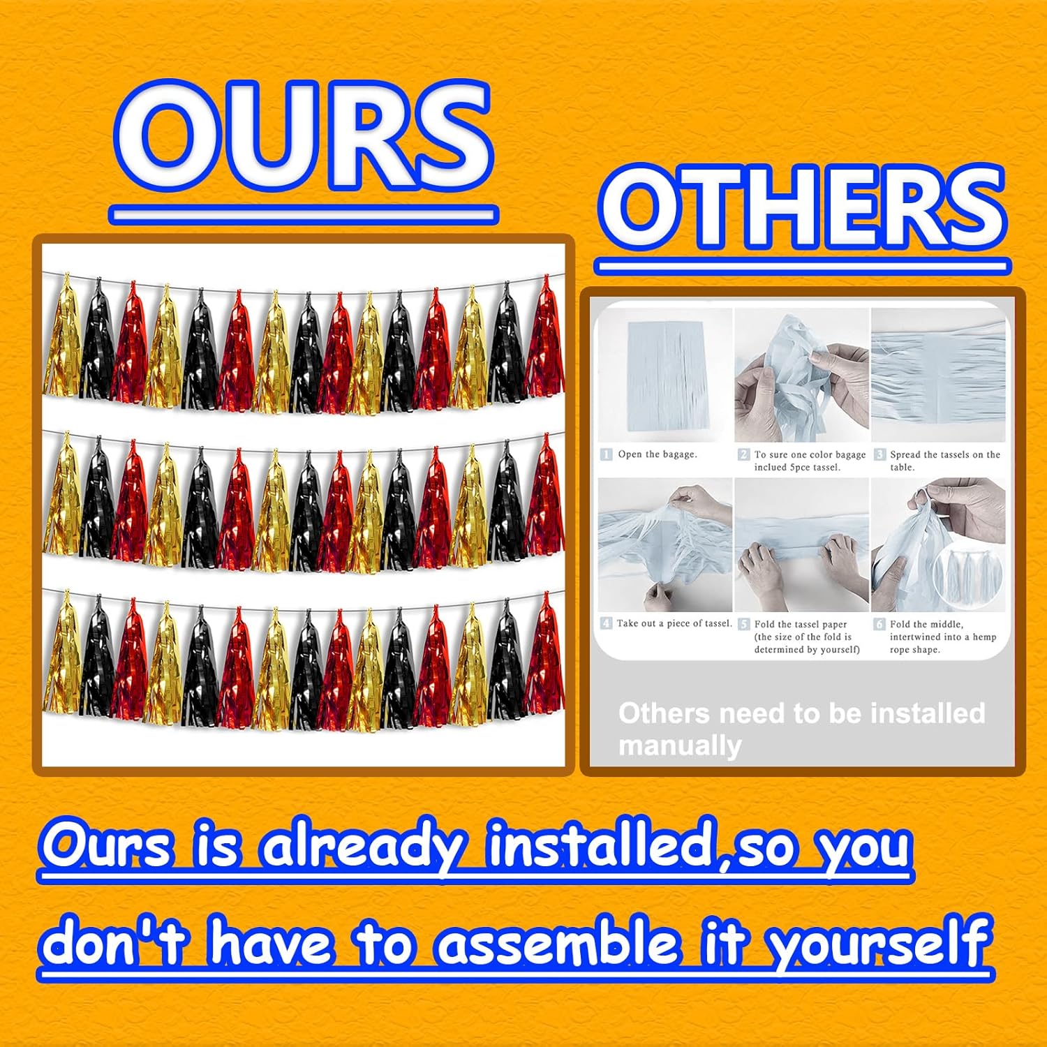 - 【Package Includes】The total length of the red black gold birthday tassels banner is 30 feet, divided into 3 strips, each 10 feet long. Each banner contains 15 tassels, and each tassel measures 14 inches, for birthday decorations many occasions uitable for Patriotic display, omecoming Float, Christmas Float, ecorative metal trailers, graduation floats etc