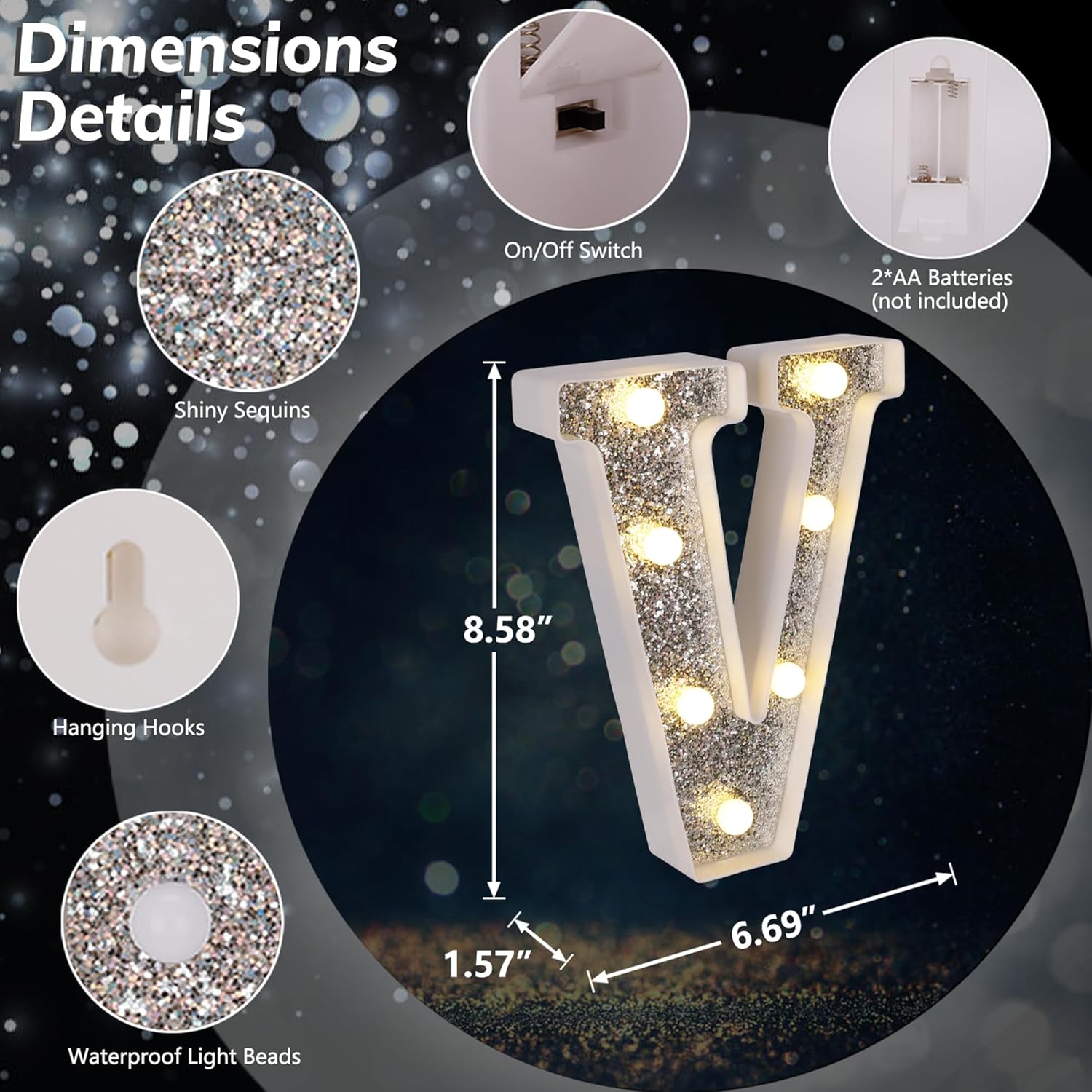 - ăGlitter Silver Marquee LED LettersăUnlike normal white lighted letters, these LED letter lights are covered with shiny silver glittering sequins. Whether it is turned on or off, these glitter marquee lights give a bright eye-catching glow. You can use it to beautify your dining table and light up your party. Create a dreamlike and romantic atmosphere.