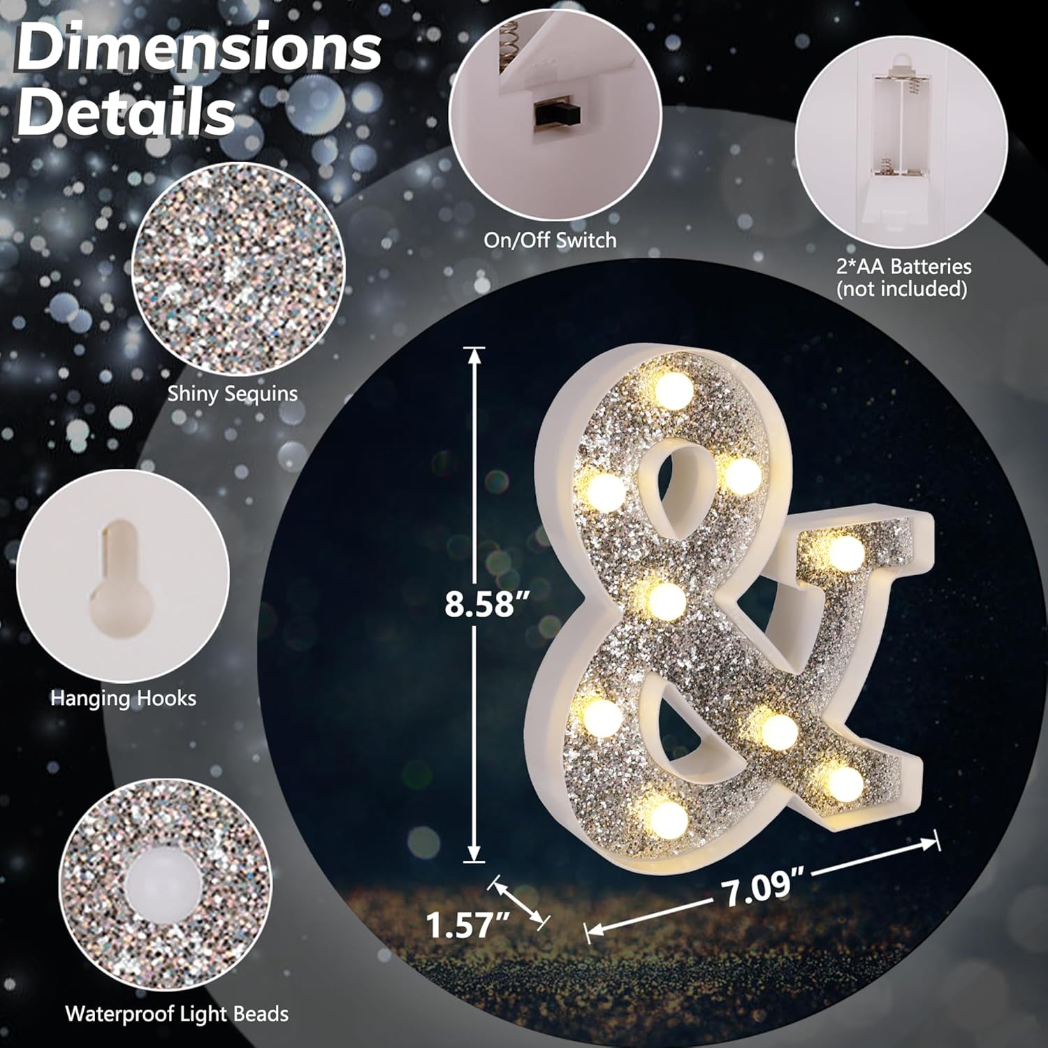 - 【Glitter Silver Marquee LED Letters】Unlike normal white lighted letters, these LED letter lights are covered with shiny silver glittering sequins. Whether it is turned on or off, these glitter marquee lights give a bright eye-catching glow. You can use it to beautify your dining table and light up your party. Create a dreamlike and romantic atmosphere.