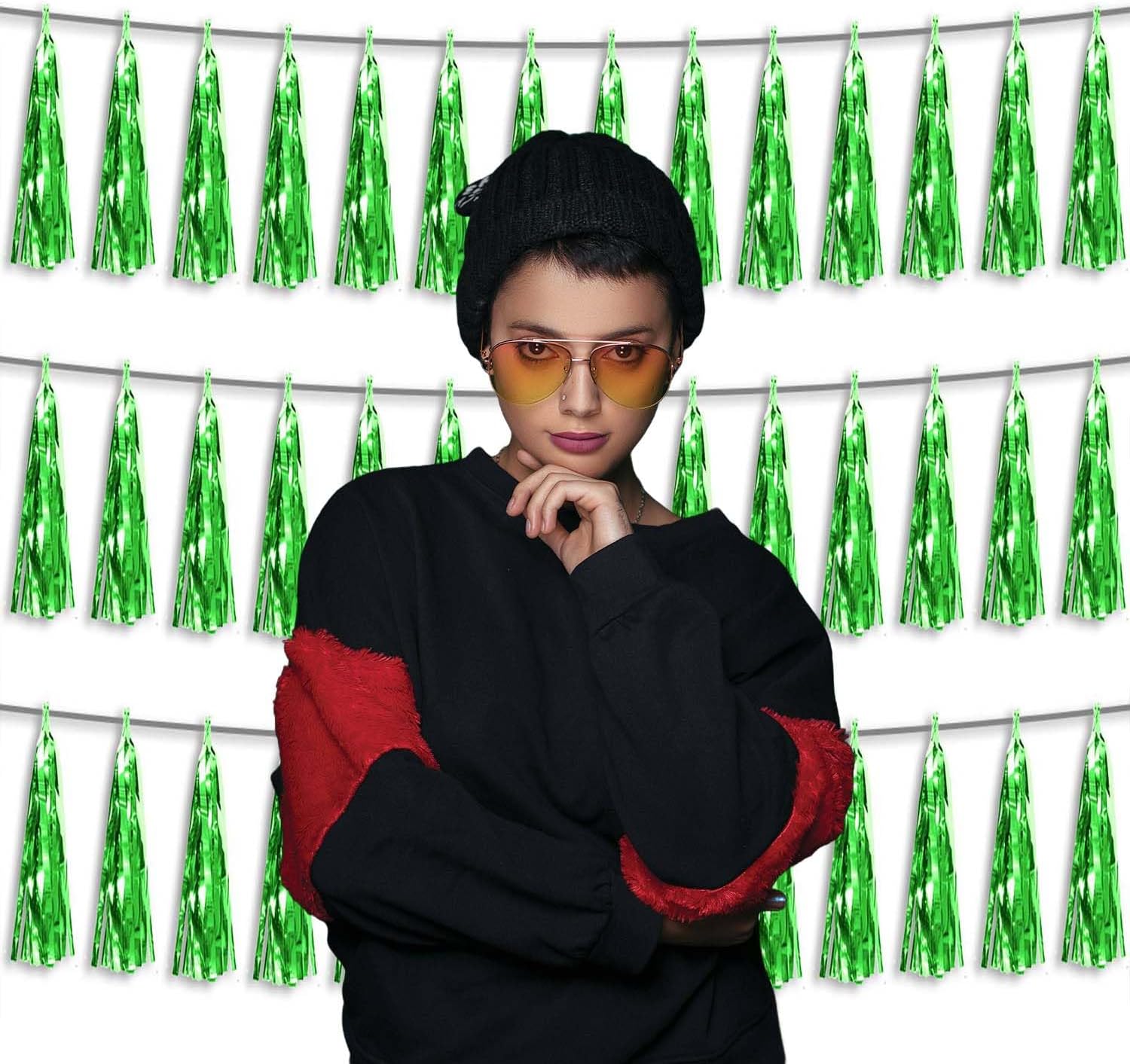 3P Metallic Fringe Tassel Banner Garland Foil Tinsel Streamer Wall Hanging Curtain Backdrop Banner for Parade Floats, Graduation Decorations, Father's Day Party Decoration(Green)