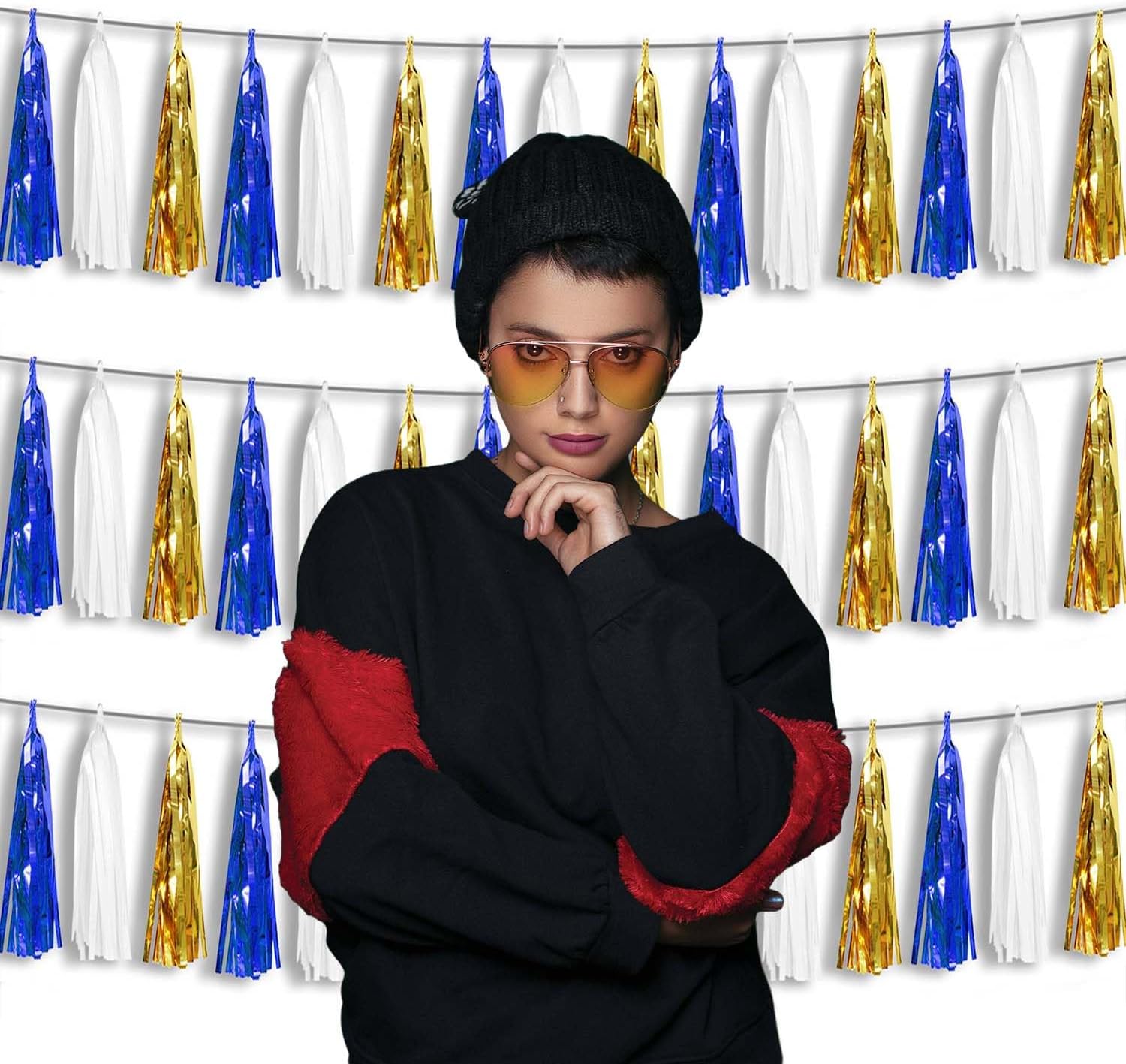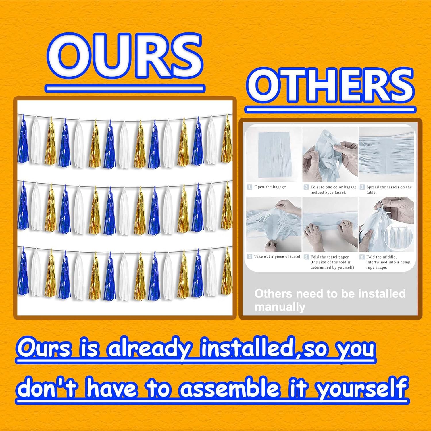- 【Package Includes】The total length of the navy blue white gold birthday tassels banner is 30 feet, divided into 3 strips, each 10 feet long. Each banner contains 15 tassels, and each tassel measures 14 inches, for birthday decorations many occasions uitable for Patriotic display, Homecoming Float, Christmas Float, ecorative metal trailers, graduation floats etc