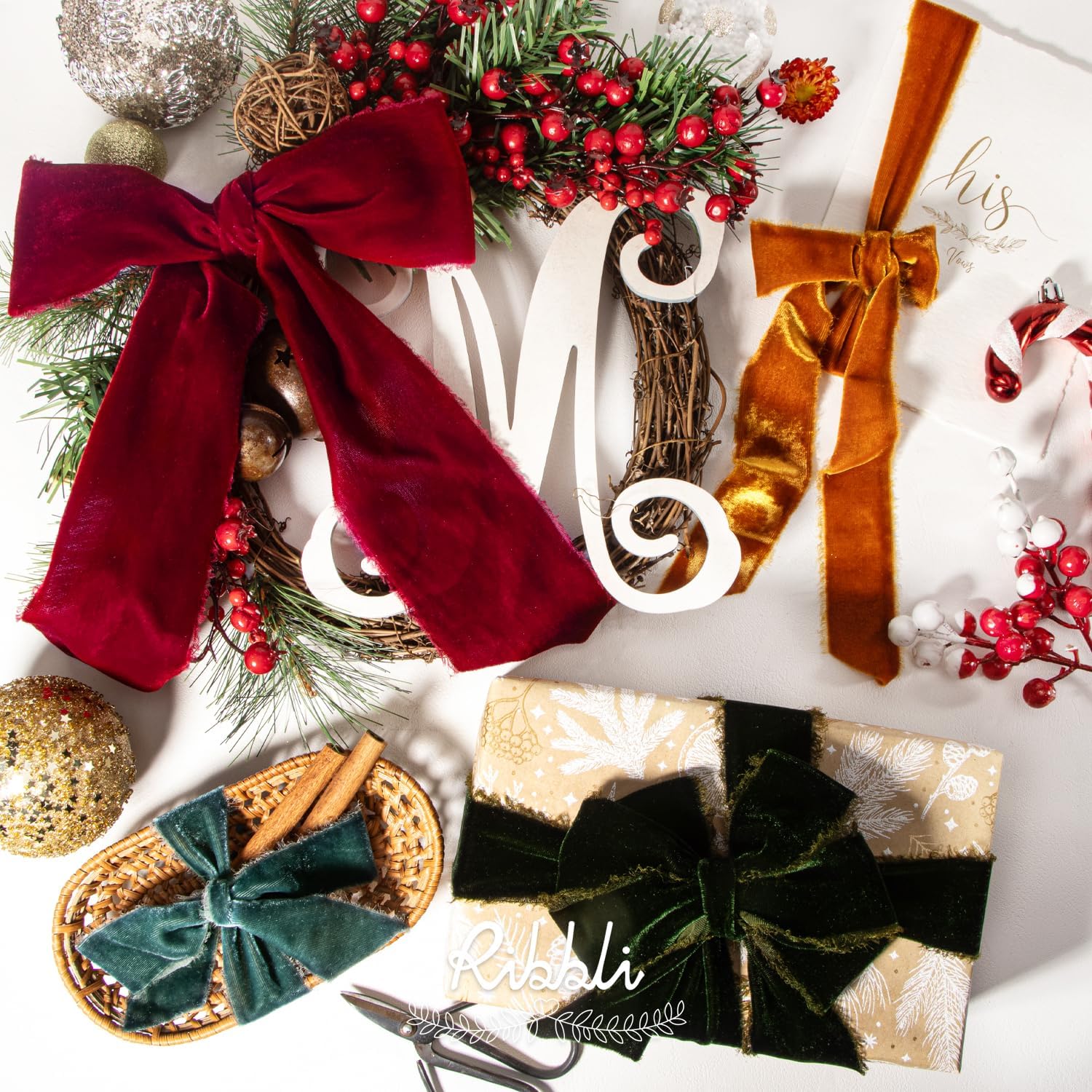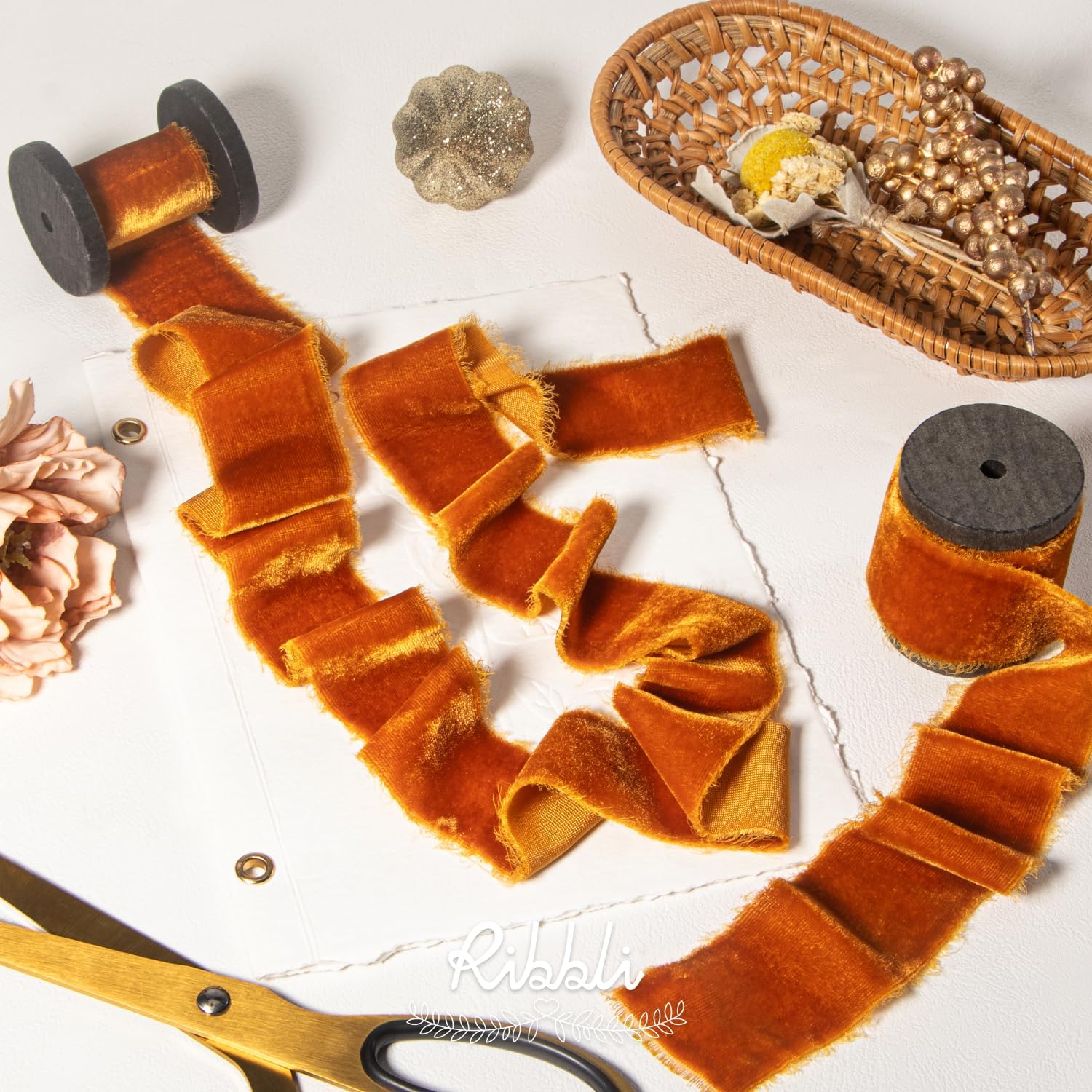 Ribbli Terracotta Velvet Ribbon 1.5 Inch Handmade Frayed Vintage Burnt Orange Christmas Ribbon for Gift Wrapping Tree Ornament Wreath Craft Home Decor -Total 3 Yards with Wooden Spool