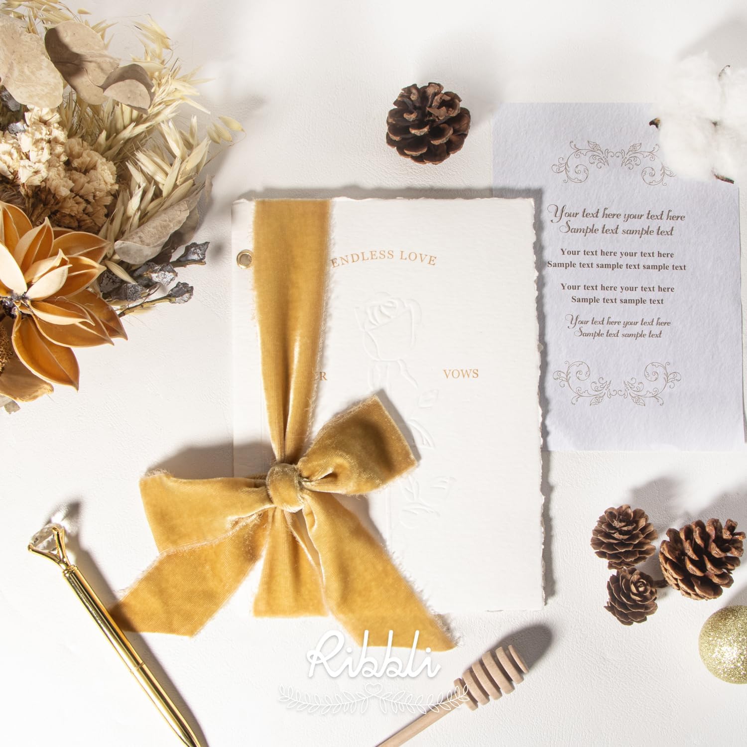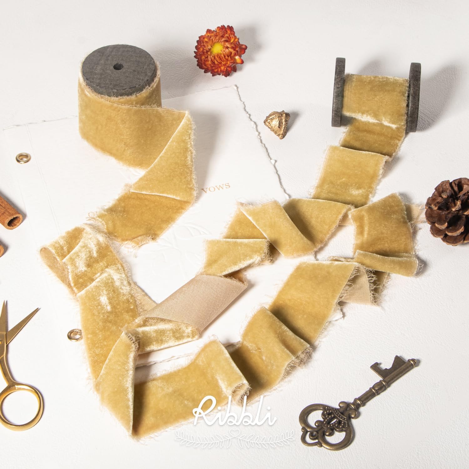 Ribbli Champagne Gold Velvet Ribbon 1.5 Inch Handmade Frayed Vintage Christmas Ribbon for Gift Wrapping Christmas Tree Ornament Wreath Craft Home Decor -Total 3 Yards with Wooden Spool