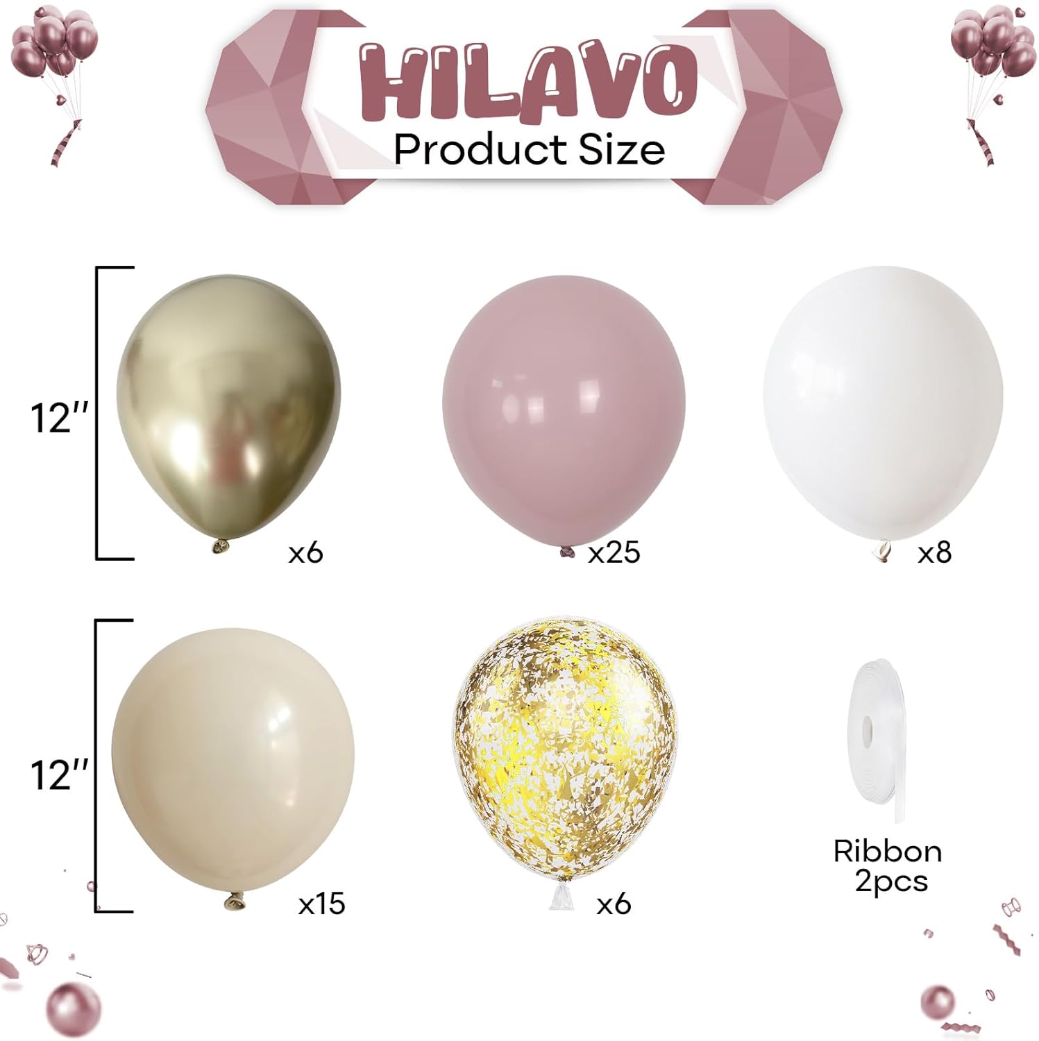 - πΈ Dusty Pink and Gold Balloons Set: This is a beautiful bright balloon, which contains balloons of different colors. Include 12 inch dusty pink balloon(25pcs), retro white sand balloon(15pcs), white balloon(8pcs), metallic gold balloon(6pcs), gold confetti balloon(6pcs), 2 rolls of ribbons. You can use these different shades of fog pink and gold balloon kits, DIY balloon combinations to create your birthday party.