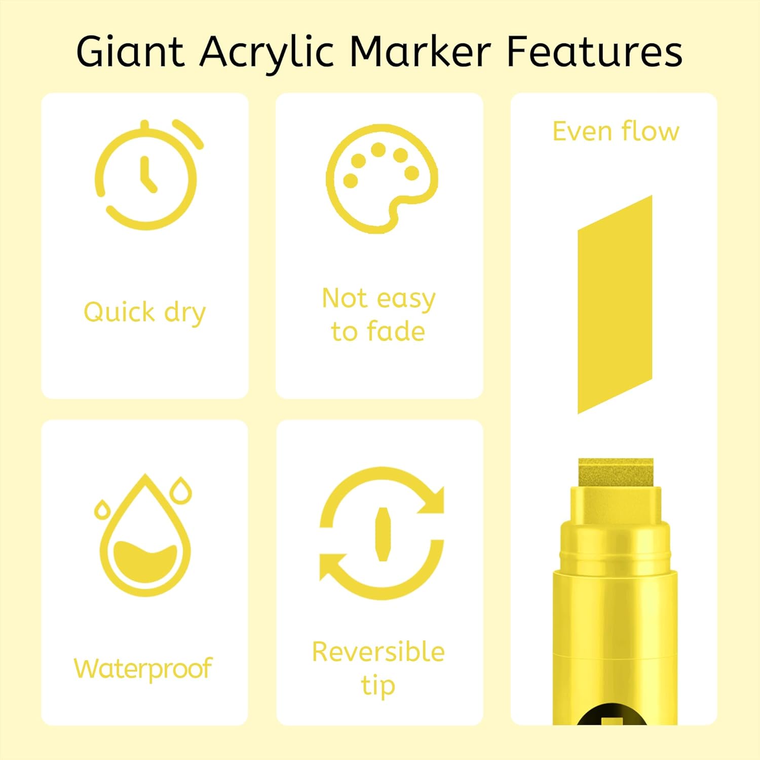 - Jumbo Permanent Markers Yellow Set: BIGTHUMB jumbo yellow markers are made with the highest-quality non-toxic, acid-free, no odor, no-leakage water-based acrylic ink that is waterproof, quick dry, long-lasting, and smooth ink flow. Each fat permanent marker conforms to ASTM d-4236 and EN-71 safety standards.