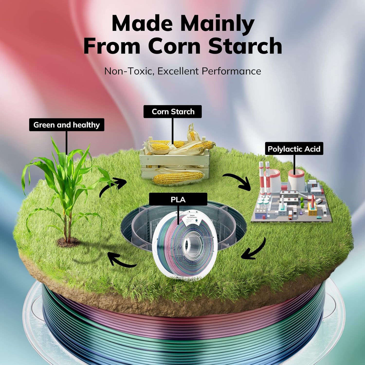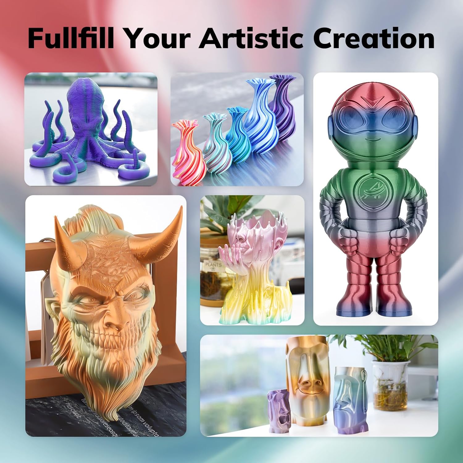 - Eye-catching Silk PLA: Shiny multicolor rainbow combination of 1.75mm PLA filament, fast gradient Red Blue Green Grey color change rainbow around 10m change one. Without polishing, you can get a gorgeous 3D printing surface, make your 3d prints stand out from the crowd