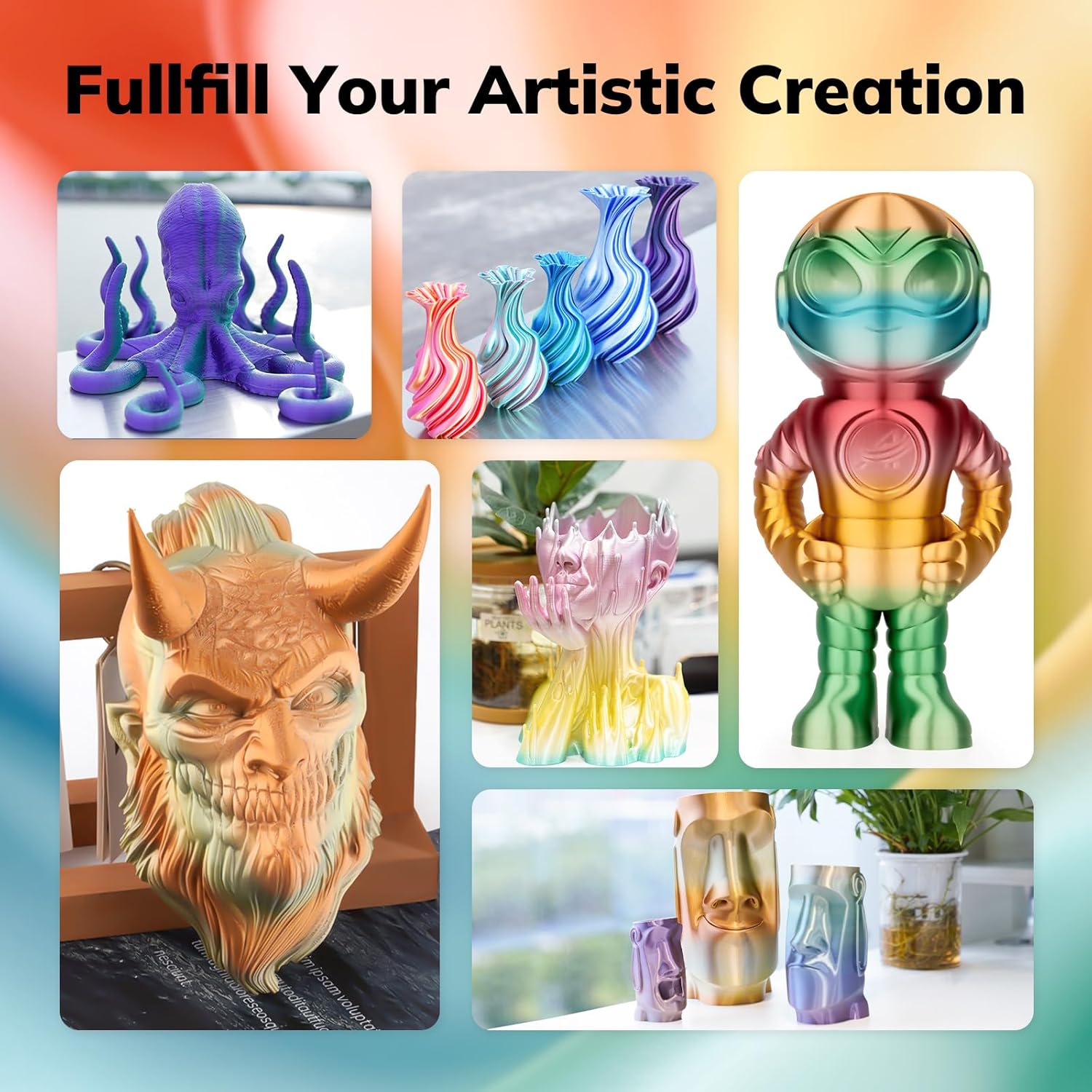 - Eye-catching Silk PLA: Shiny multicolor rainbow combination of 1.75mm PLA filament, fast gradient color change rainbow around 10m change one. Without polishing, you can get a gorgeous 3D printing surface, make your 3d prints stand out from the crowd