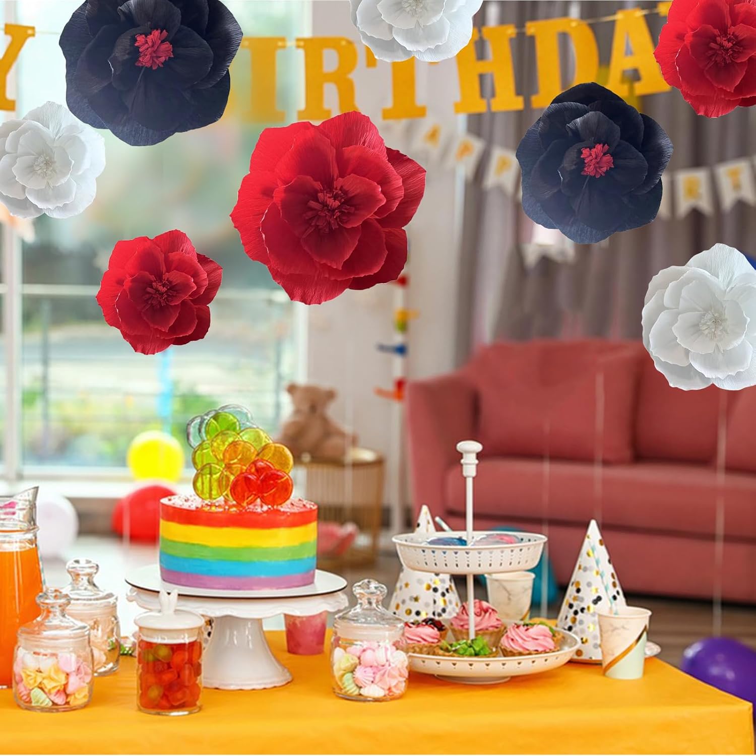 BRT Bearingshui Crepe Paper Flowers Decoration for Wall Total 9 Pcs, Artificial Flowers for Wedding Flower Backdrop Decor, Baby Bridal Shower Birthday Party, Red Black White 3D Wall Flowers Decor